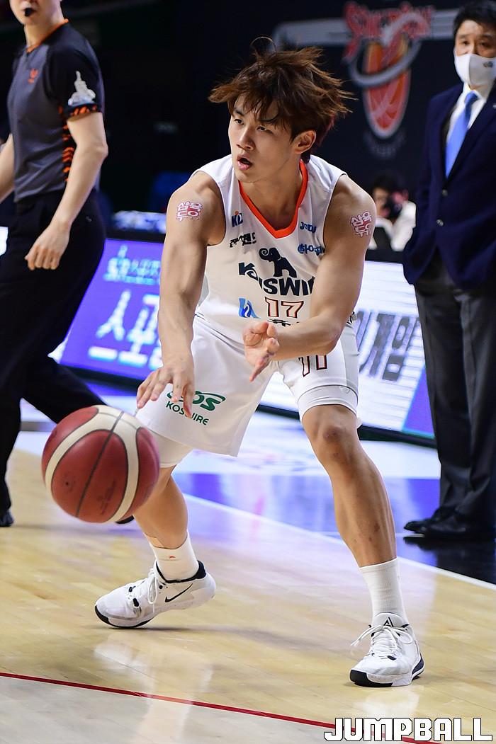 [점프볼=부산/박상혁 기자] 27일 부산사직체육관에서 열린 2020-2021 현대모비스 프로농구 부산 KT와 인천 전자랜드의 경기, 전자랜드 양재혁이 골밑으로 패스를 시도하고 있다.