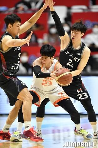 27일 수원 kt 소닉붐 아레나에서 열린 2022-2023 SKT 에이닷 프로농구 수원 kt와 고양 캐롯의 경기, 캐롯 이정현이 골밑을 파고 들며 패스를 내주고 있다 [점프볼=수원/유용우 기자]