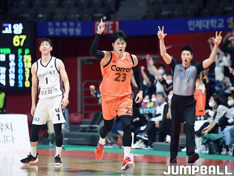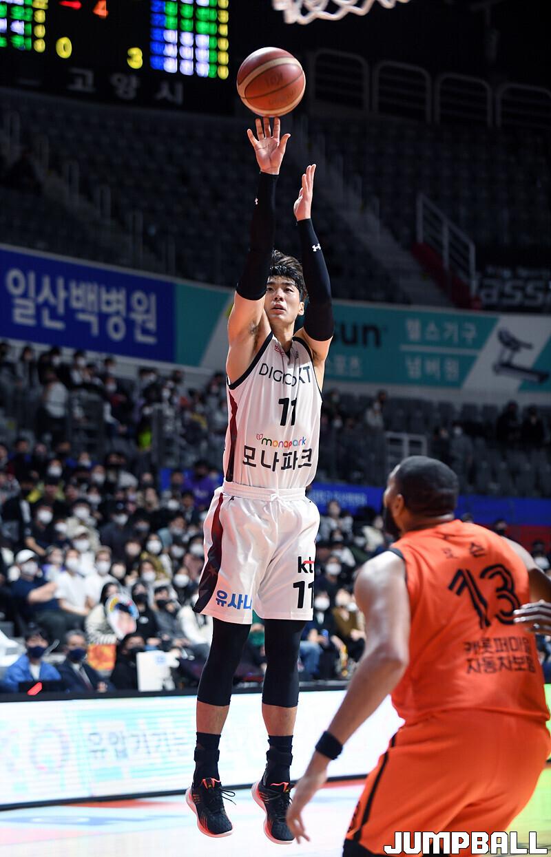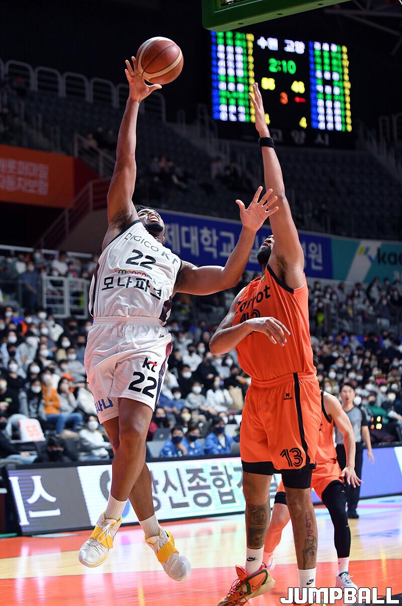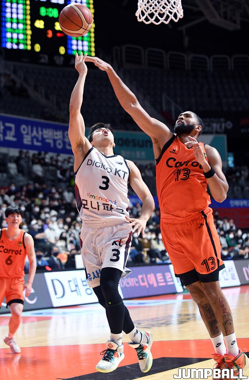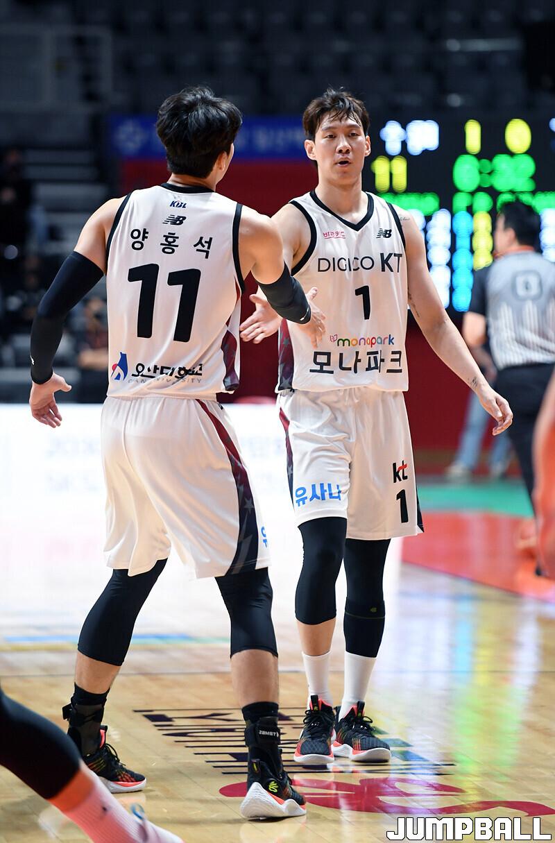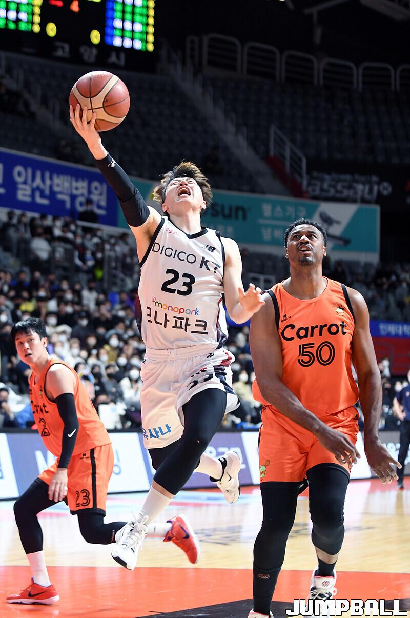 수원 KT는 19일 고양체육관에서 열린 고양 캐롯과의 2022-2023 SKT 에이닷 프로농구 정규리그 원정경기에서 접전 끝에 72-70 신승을 거뒀다.
