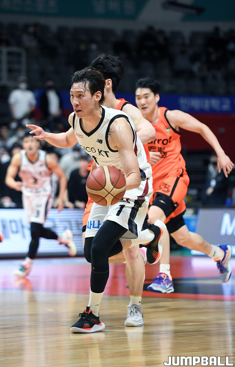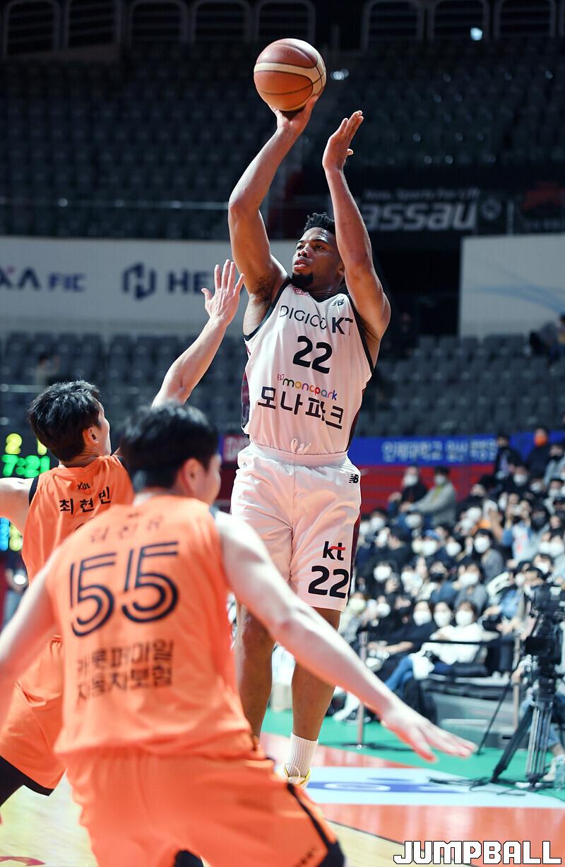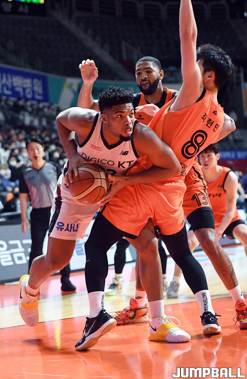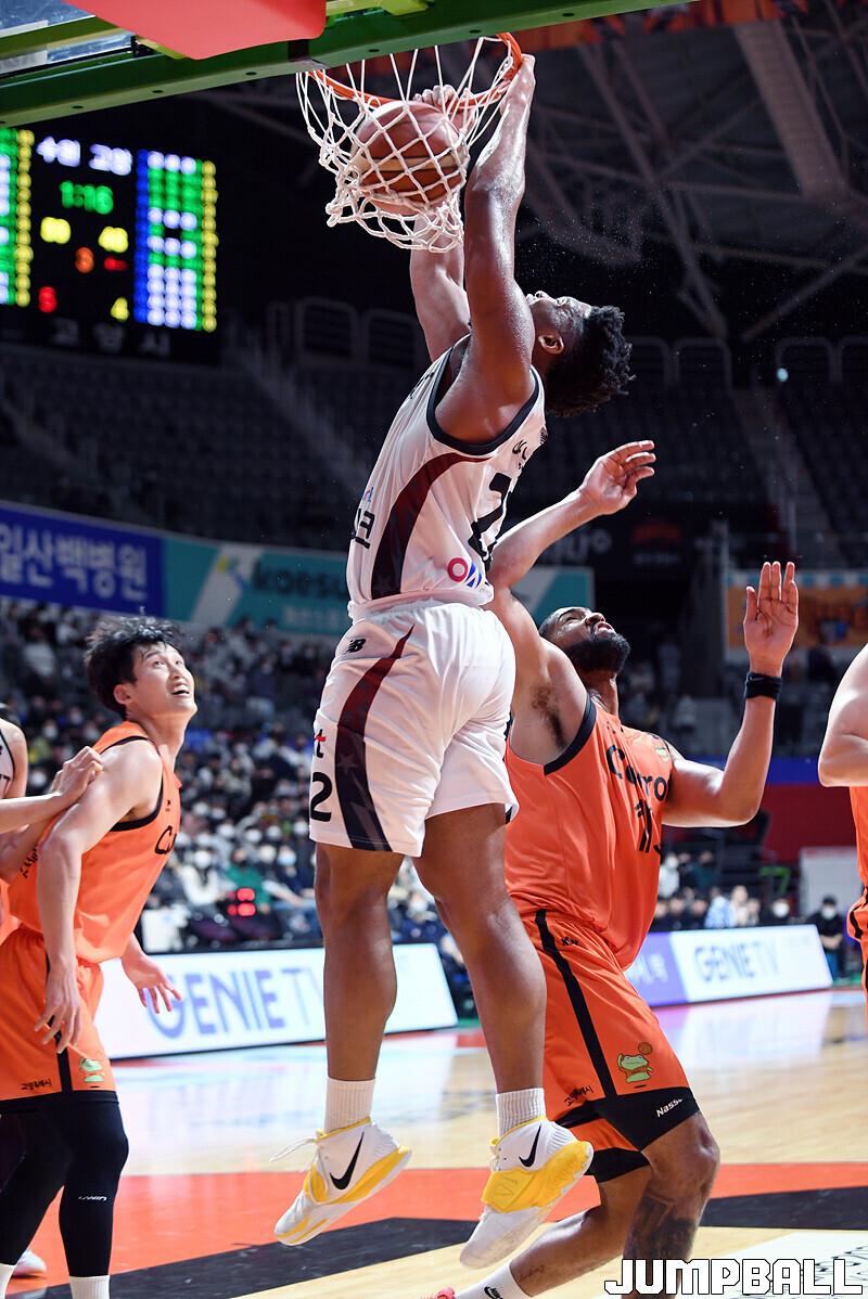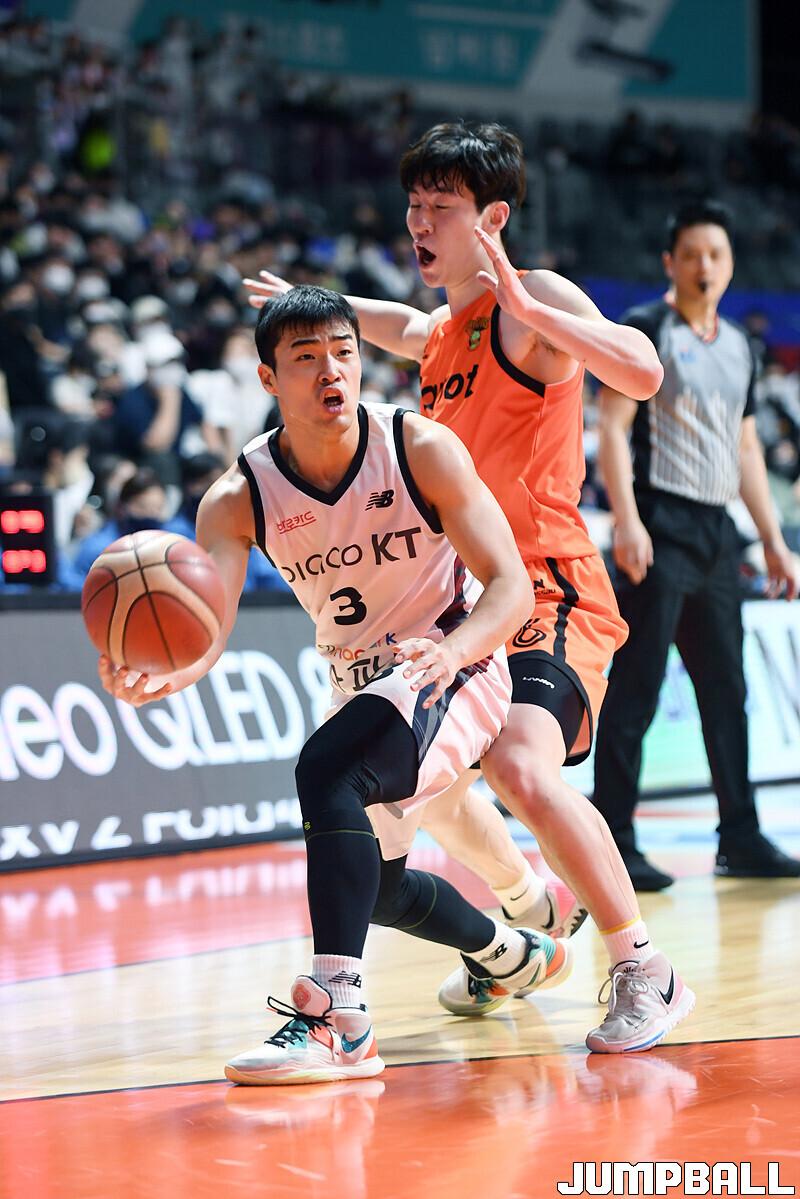 수원 KT는 19일 고양체육관에서 열린 고양 캐롯과의 2022-2023 SKT 에이닷 프로농구 정규리그 원정경기에서 접전 끝에 72-70 신승을 거뒀다.