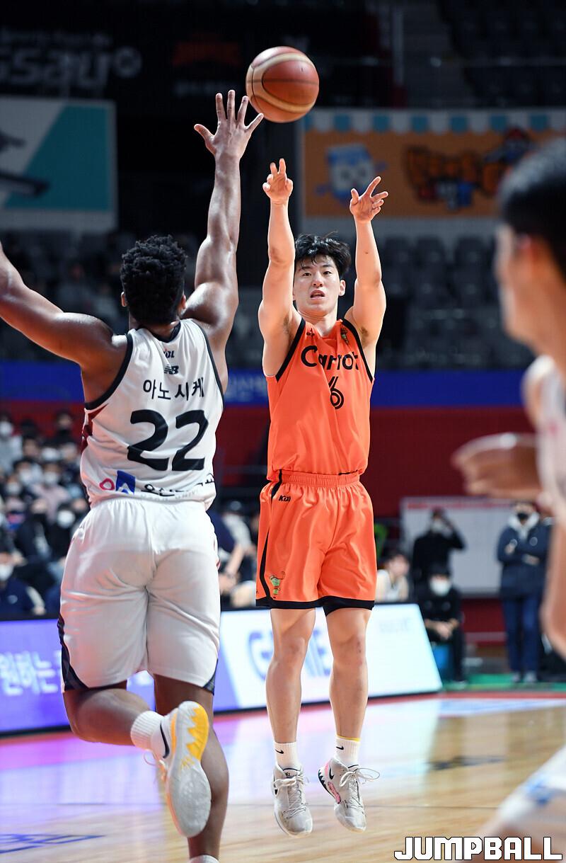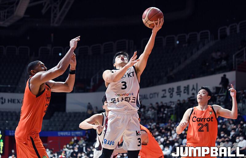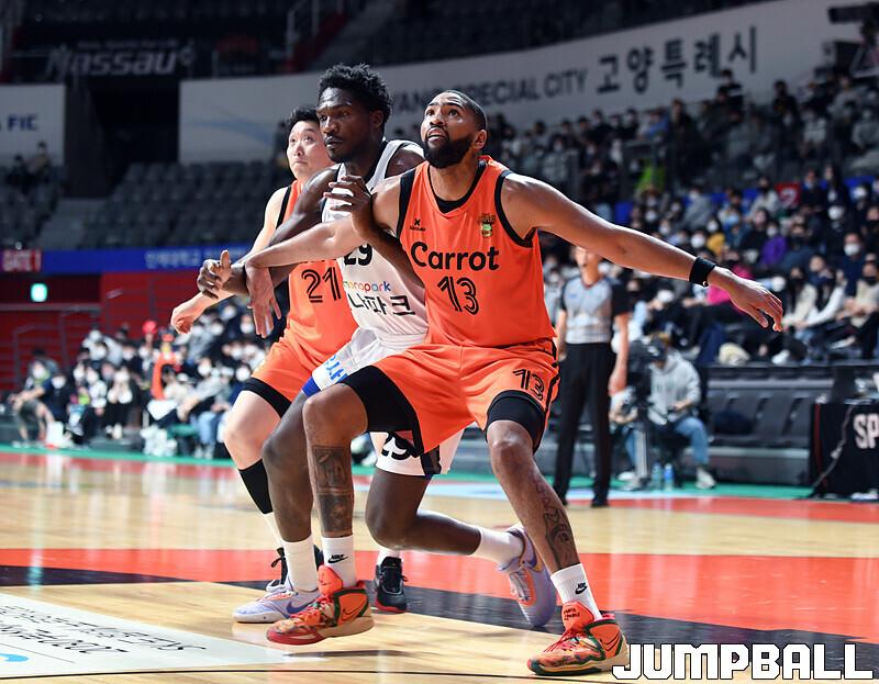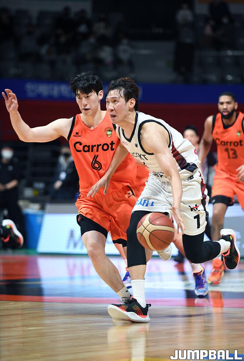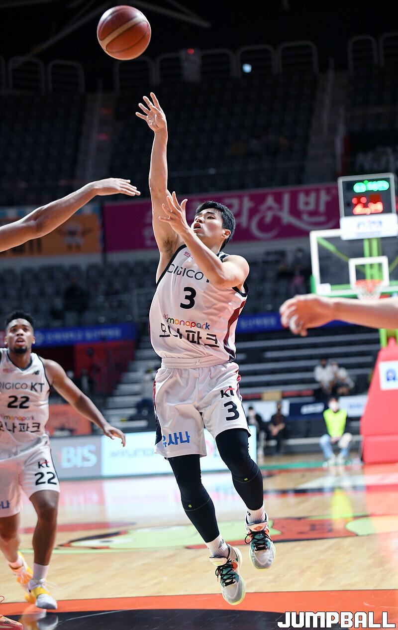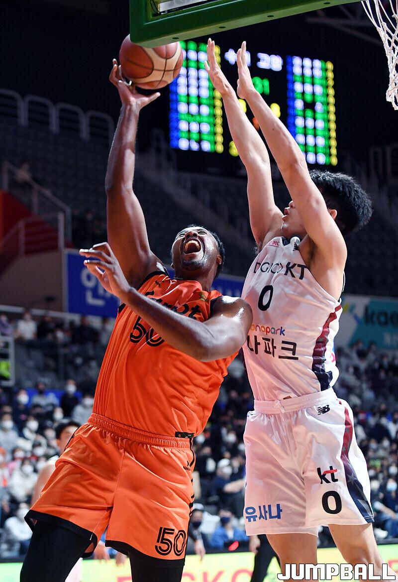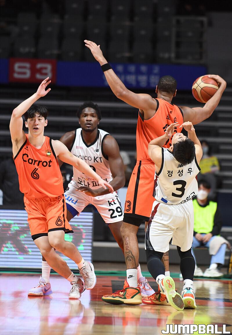 수원 KT는 19일 고양체육관에서 열린 고양 캐롯과의 2022-2023 SKT 에이닷 프로농구 정규리그 원정경기에서 접전 끝에 72-70 신승을 거뒀다.