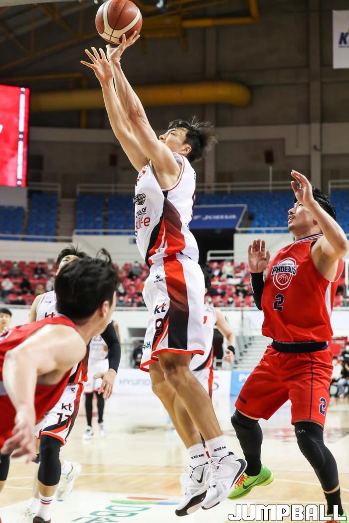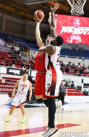 [점프볼=윤민호 기자] 24 울산 동천체육관에서 열린 2020-2021 현대모비스 프로농구 울산현대모비스와 부산 KT 경기에서 KT 김영환이 현대모비스 이현민의 수비를 피해 슛을 하고 있다.