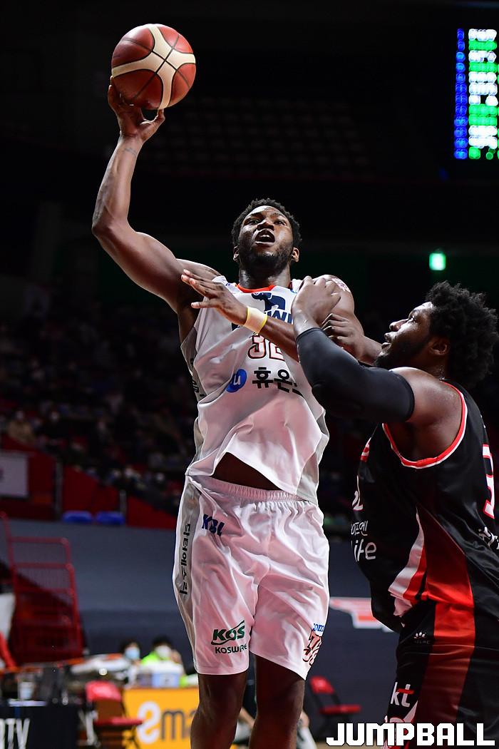 [점프볼=부산/박상혁 기자] 27일 부산사직체육관에서 열린 2020-2021 현대모비스 프로농구 부산 KT와 인천 전자랜드의 경기, 전자랜드 에릭 탐슨이 슛을 시도하고 있다.