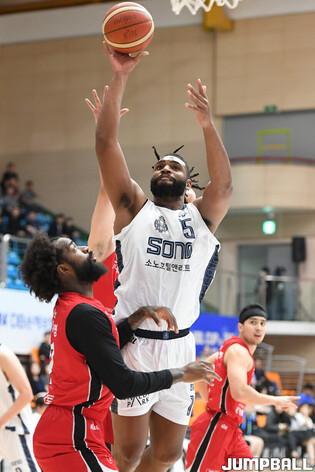 [점프볼=제천/박상혁 기자] 7일 제천체육관에서 열린 2024 DB손해보험 KBL 컵대회 in 제천 안양 정관장과 고양 소노의 경기, 정관장 캐디 라렌이 점프슛을 시도하고 있다.