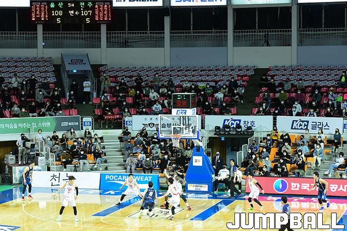 24일 전주실내체육관에서 열린 2021-2022 KGC인삼공사 정관장 프로농구 전주 KCC와 울산 현대모비스의 경기, KCC가 2차 연장 접전끝에 현대모비스에 109-108로 승리했다. KCC와 현대모비스 경기 화보.