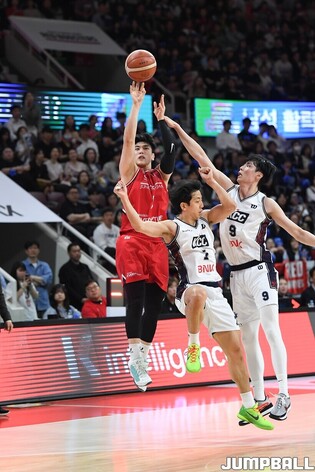 [점프볼=안양/유용우 기자] 24일 안양 정관장 아레나에서 열린 2025~2026 LG전자 프로농구 4강 플레이오프 1차전 안양 정관장과 부산 KCC의 경기, 정관장 전성현이 3점슛을 성공하고 있다.