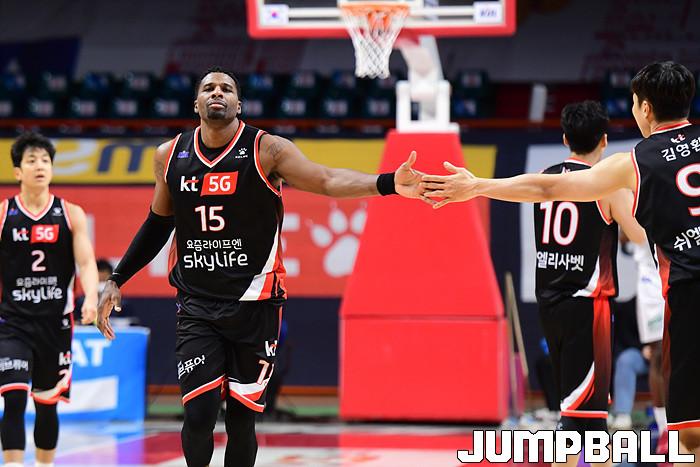 [점프볼=부산/박상혁 기자] 15일 부산사직체육관에서 열린 2020-2021 현대모비스 프로농구 부산 KT와 인천 전자랜드의 경기, KT 브랜드 브라운과 김영환이 하이파이브를 하고 있다.