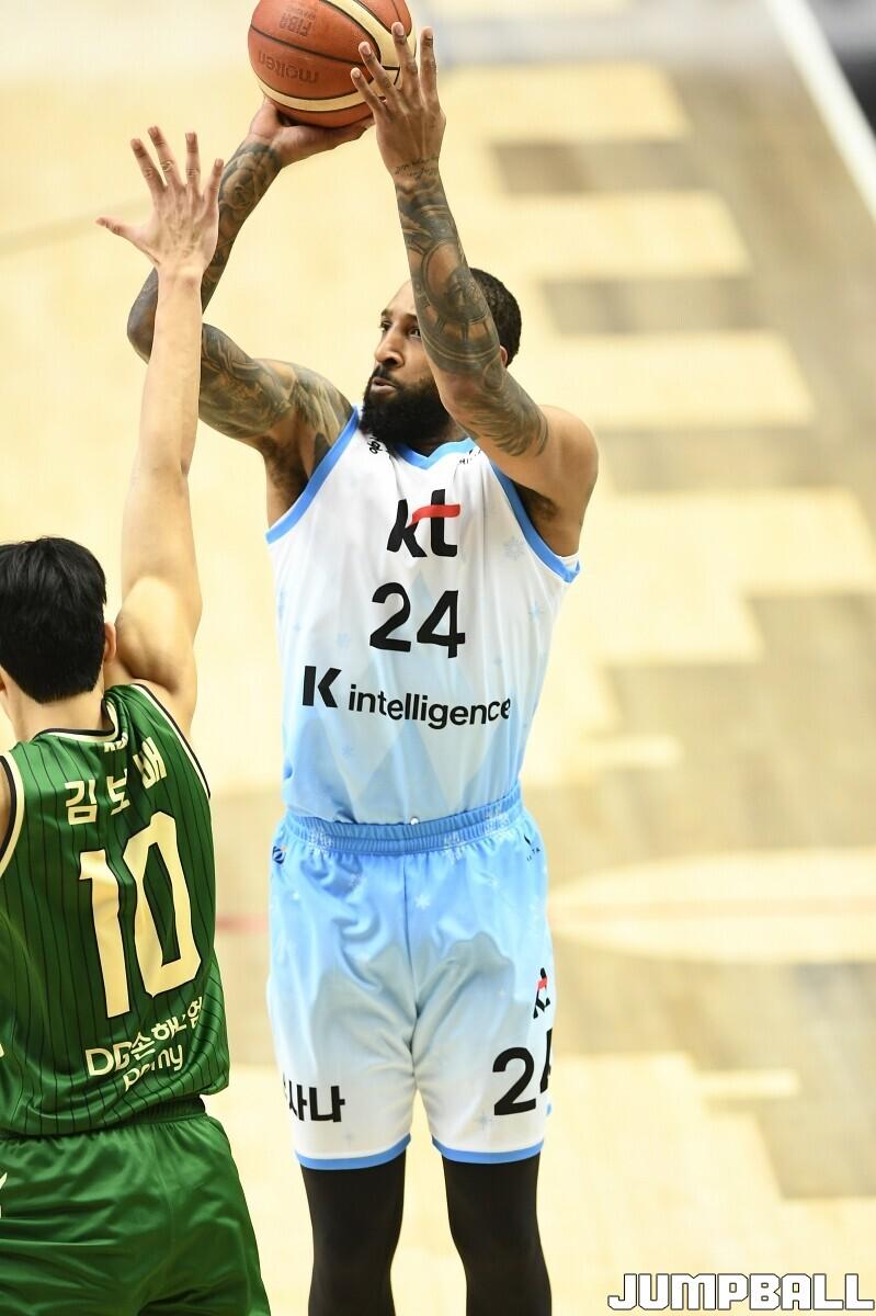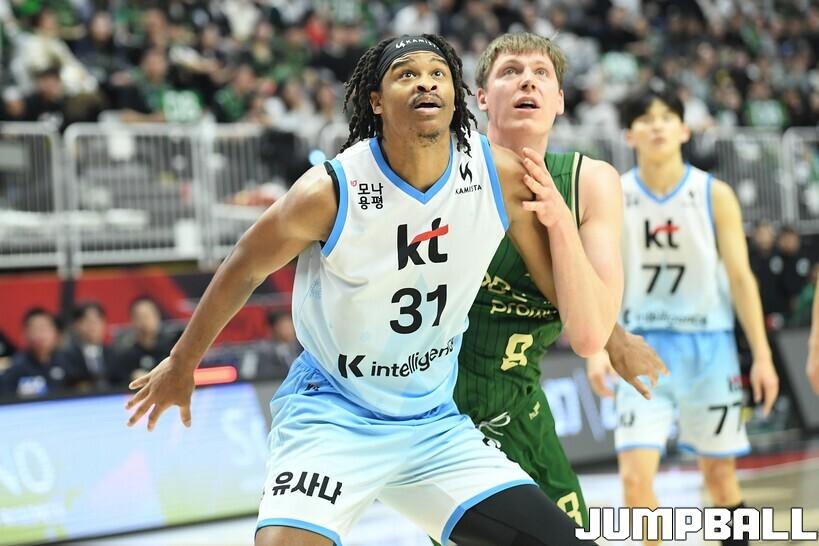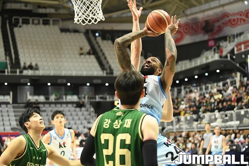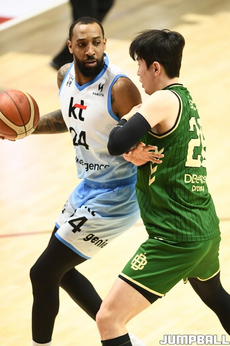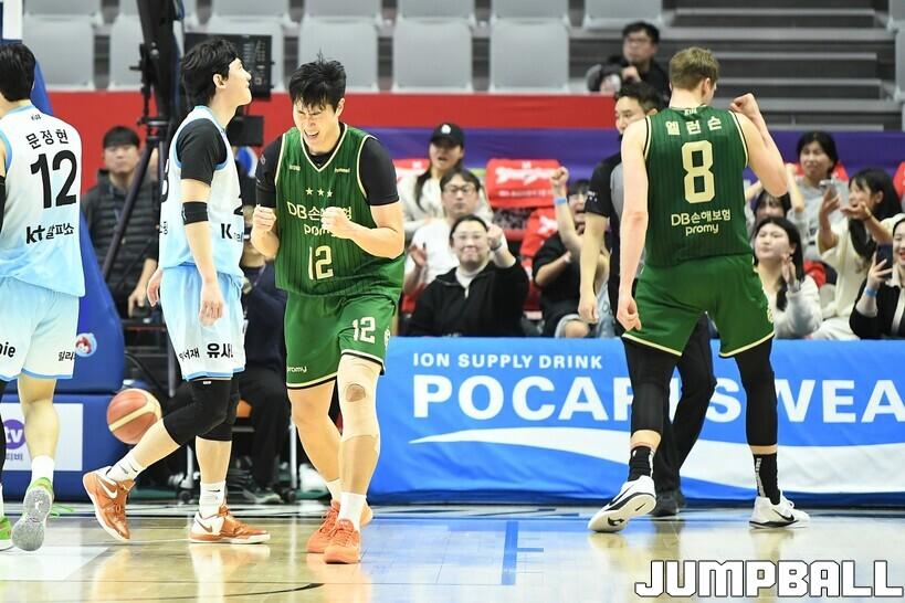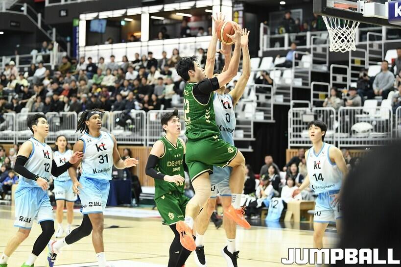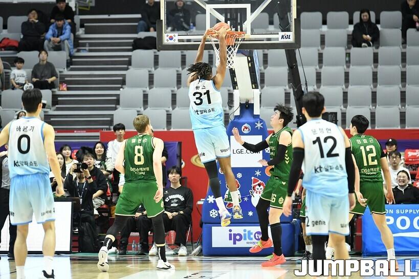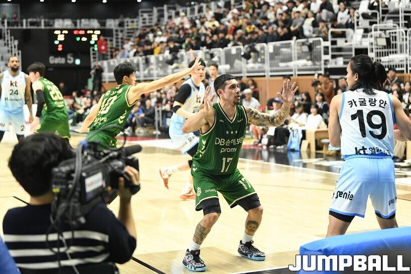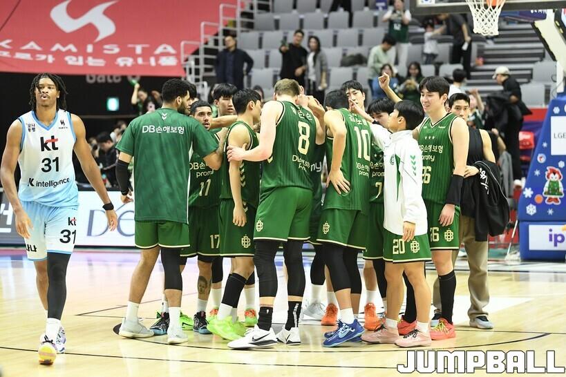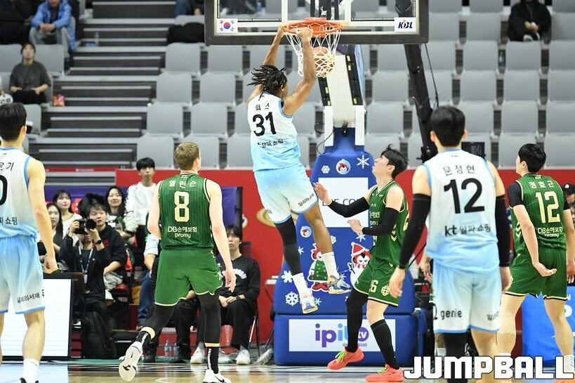 [점프볼=수원/유용우 기자] 19일 수원 KT 소닉붐 아레나에서 열린 2025-2026 LG전자 프로농구 수원 KT와 원주 DB의 경기, DB가 헨리 엘런슨의 38점 12리바운드 더블더블 맹활약에 힘입어 KT에 83-81 역전승을 거뒀다.