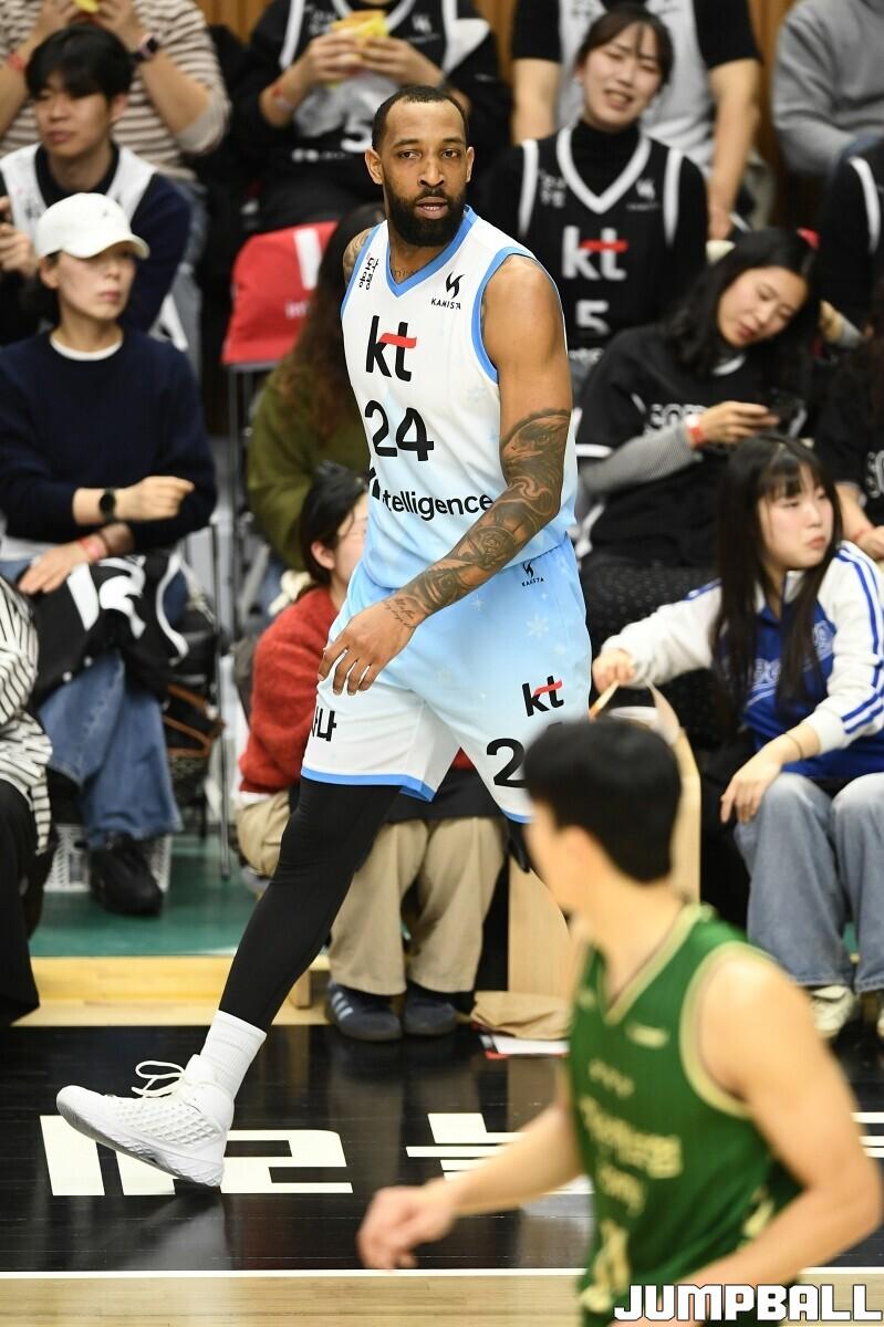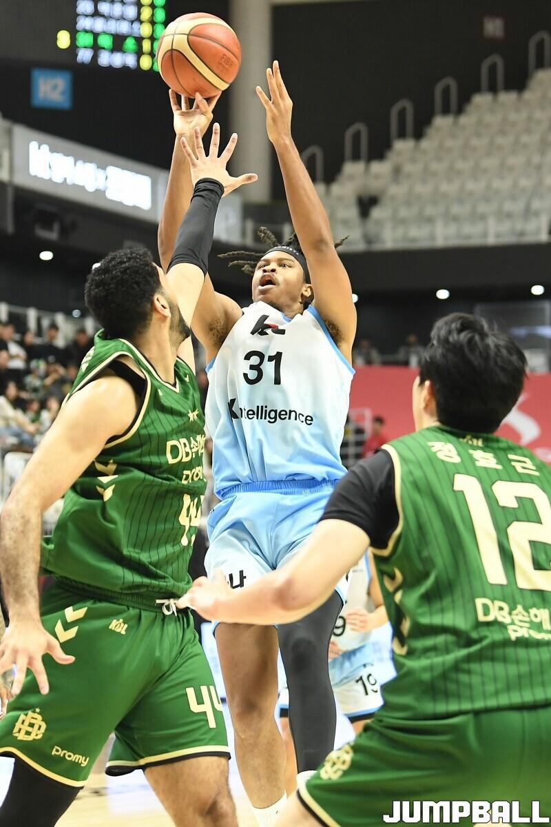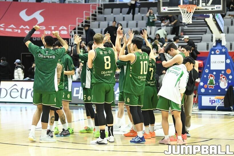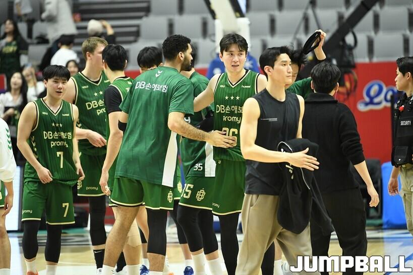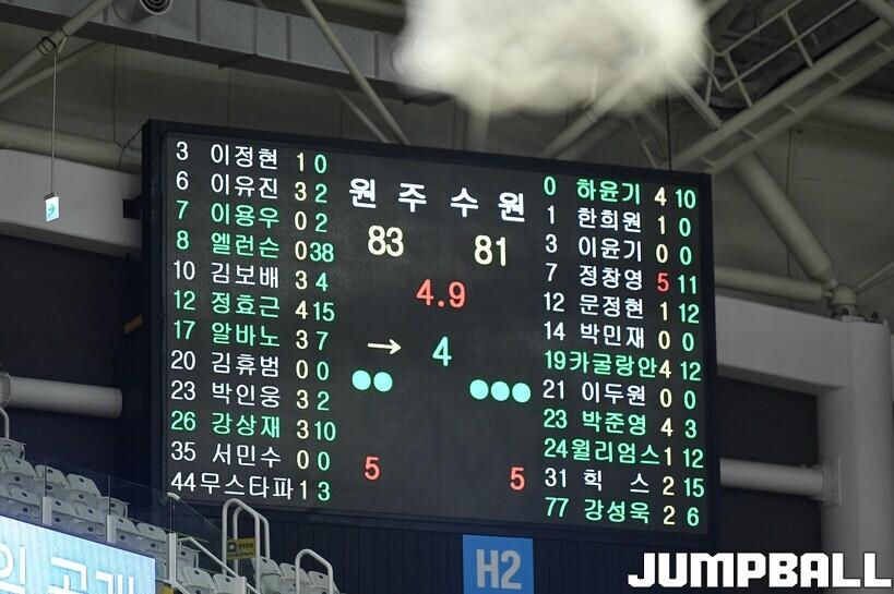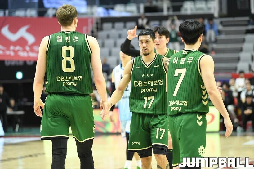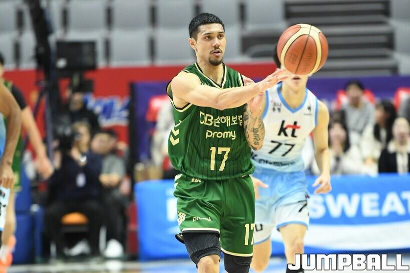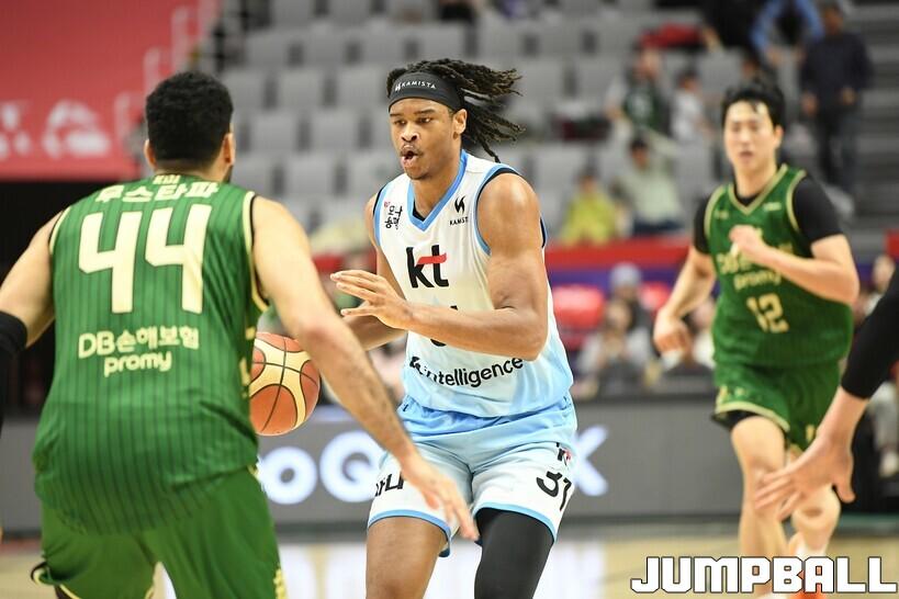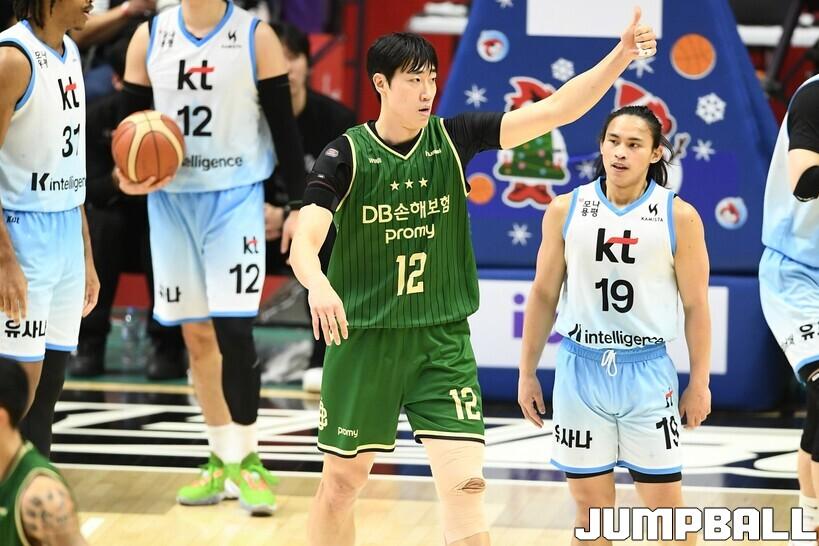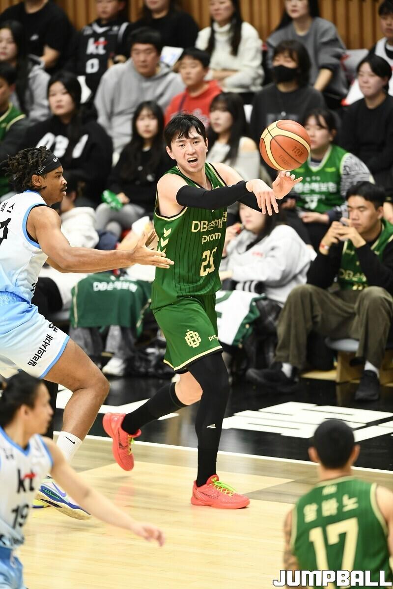 [점프볼=수원/유용우 기자] 19일 수원 KT 소닉붐 아레나에서 열린 2025-2026 LG전자 프로농구 수원 KT와 원주 DB의 경기, DB가 헨리 엘런슨의 38점 12리바운드 더블더블 맹활약에 힘입어 KT에 83-81 역전승을 거뒀다.