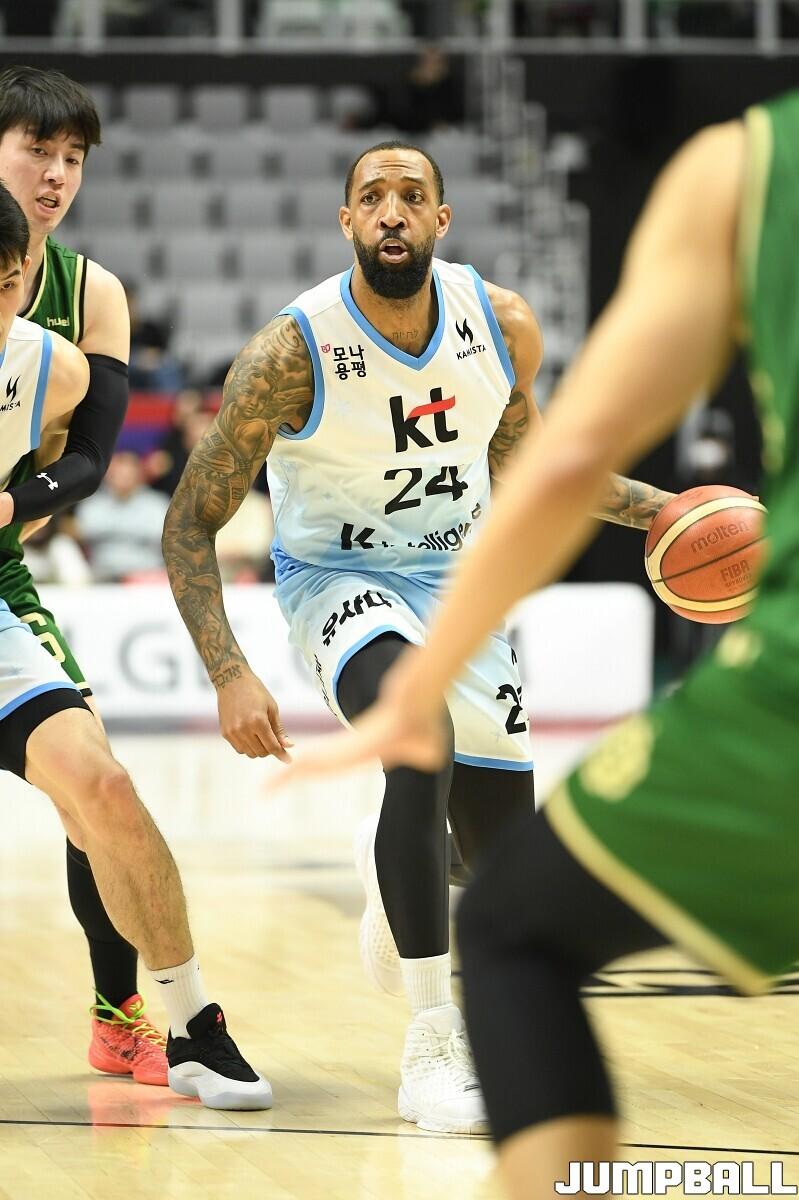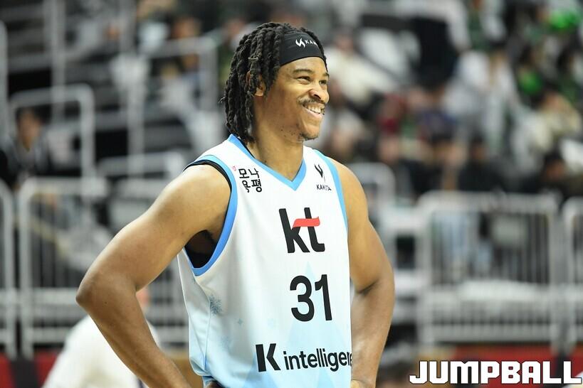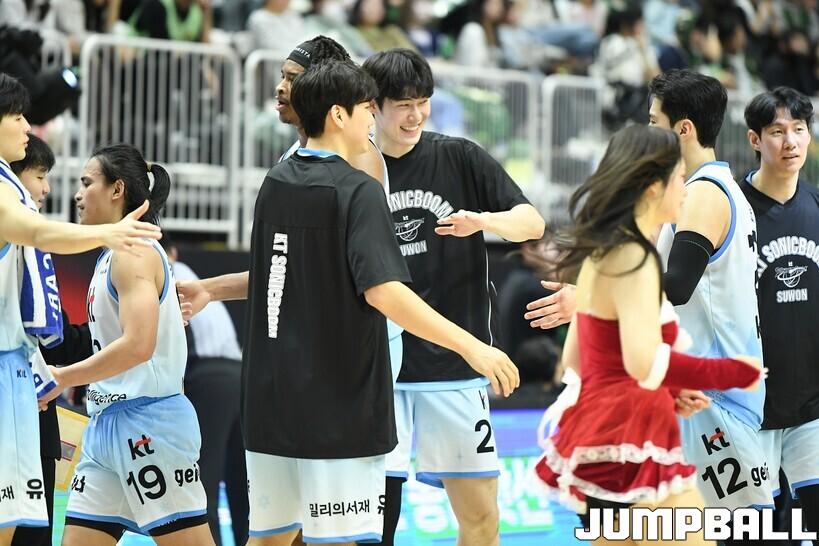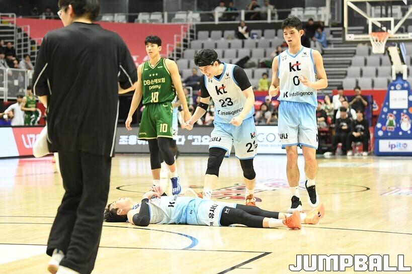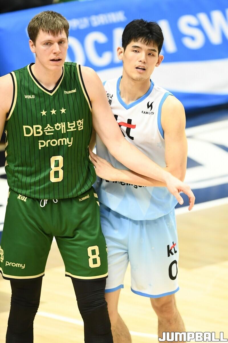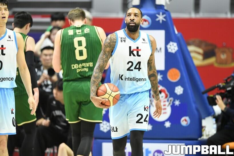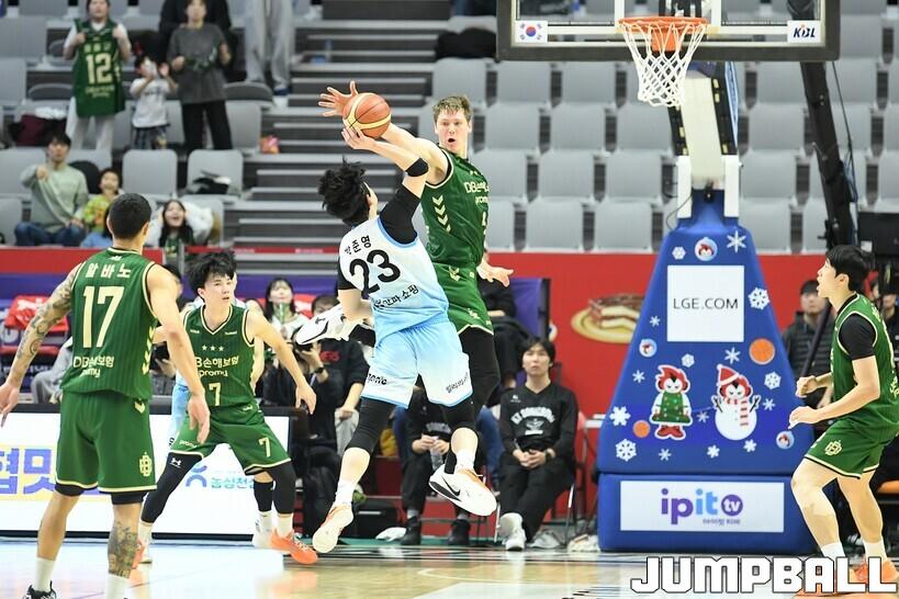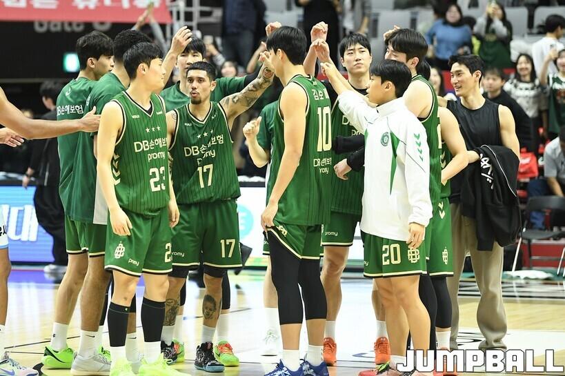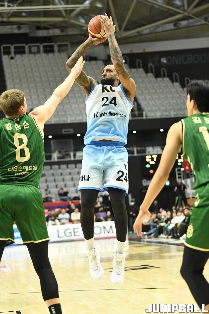 [점프볼=수원/유용우 기자] 19일 수원 KT 소닉붐 아레나에서 열린 2025-2026 LG전자 프로농구 수원 KT와 원주 DB의 경기, DB가 헨리 엘런슨의 38점 12리바운드 더블더블 맹활약에 힘입어 KT에 83-81 역전승을 거뒀다.