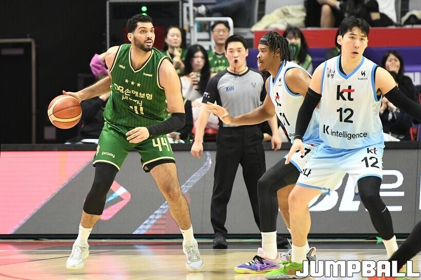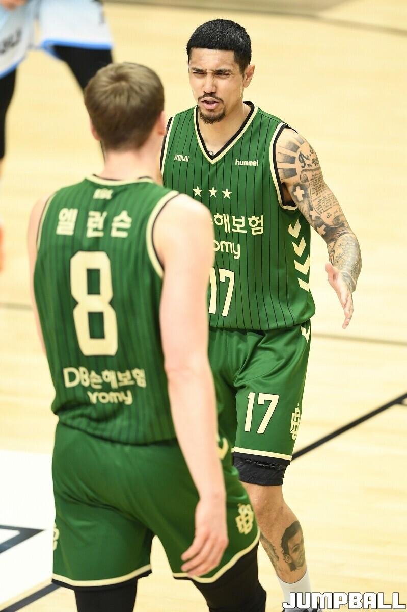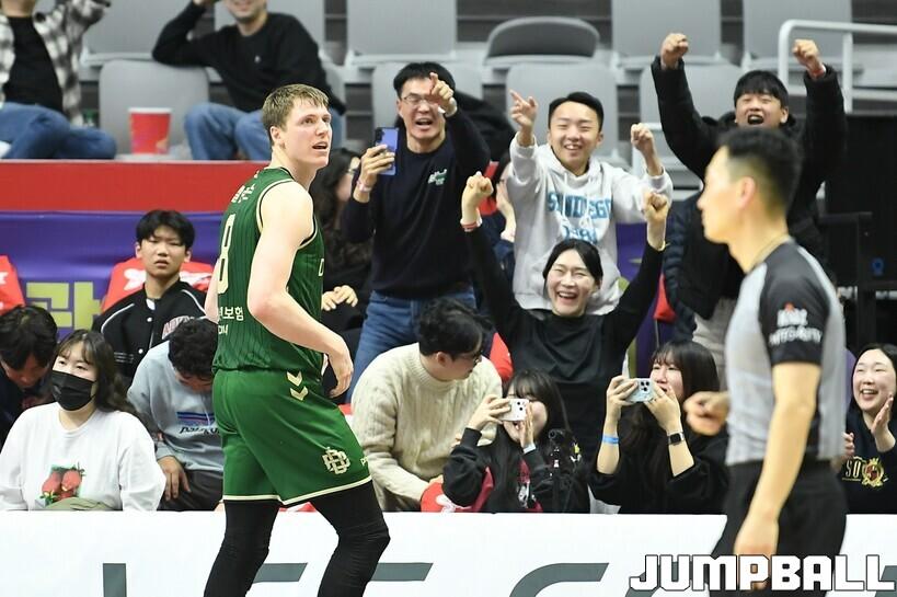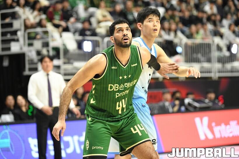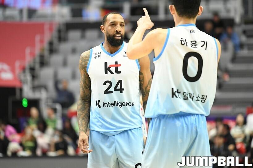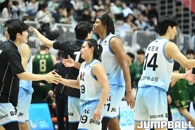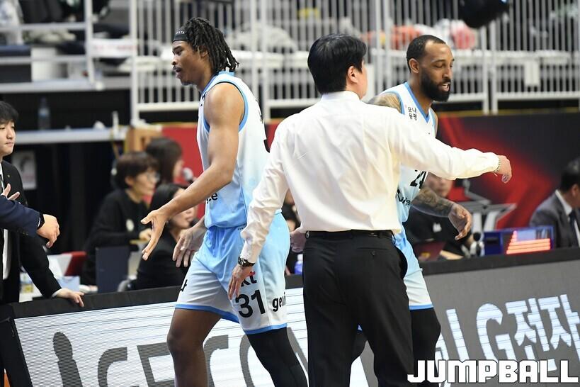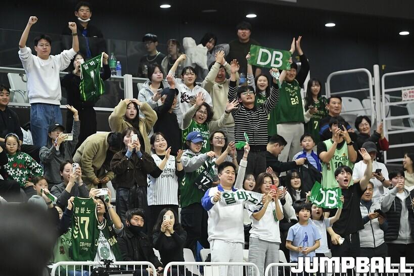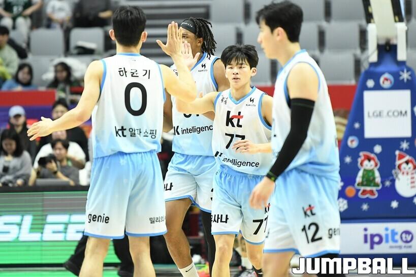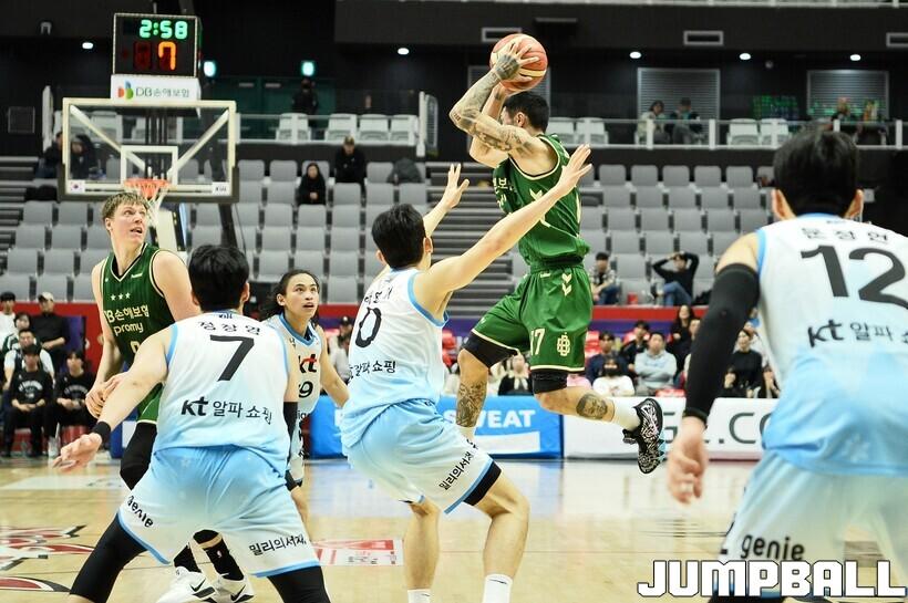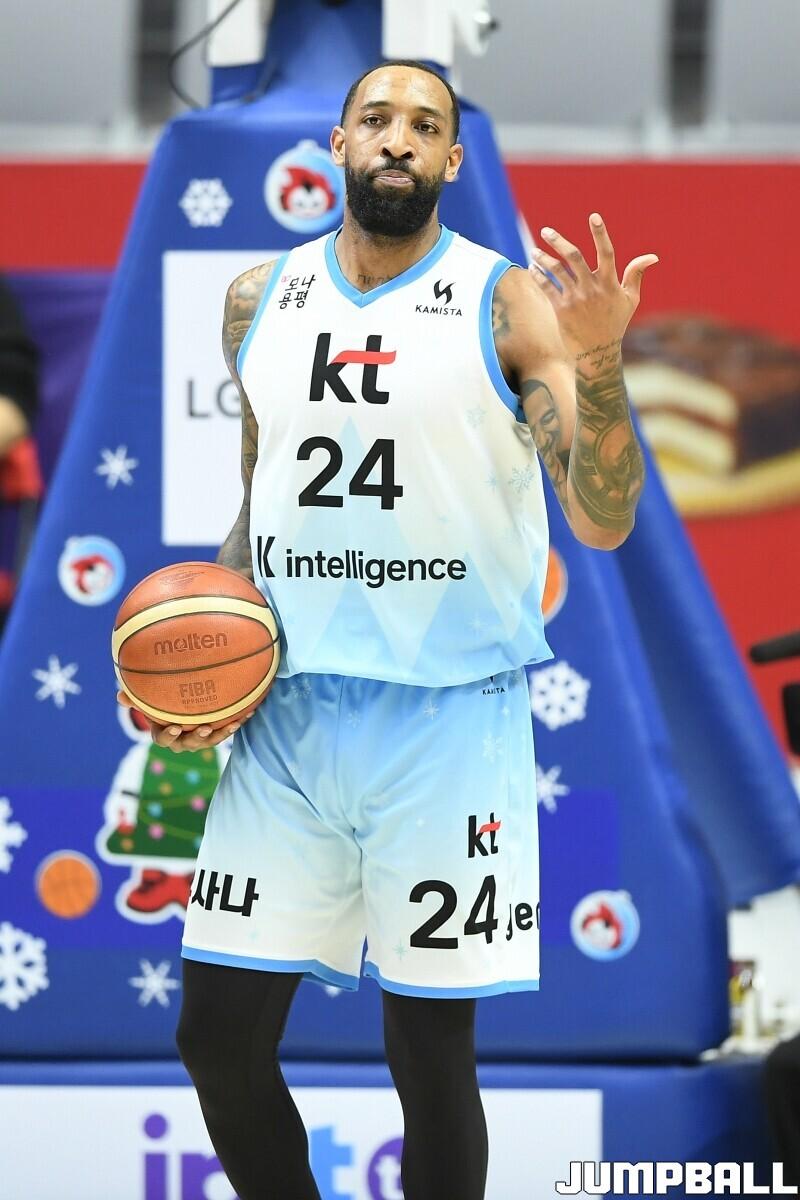 [점프볼=수원/유용우 기자] 19일 수원 KT 소닉붐 아레나에서 열린 2025-2026 LG전자 프로농구 수원 KT와 원주 DB의 경기, DB가 헨리 엘런슨의 38점 12리바운드 더블더블 맹활약에 힘입어 KT에 83-81 역전승을 거뒀다.