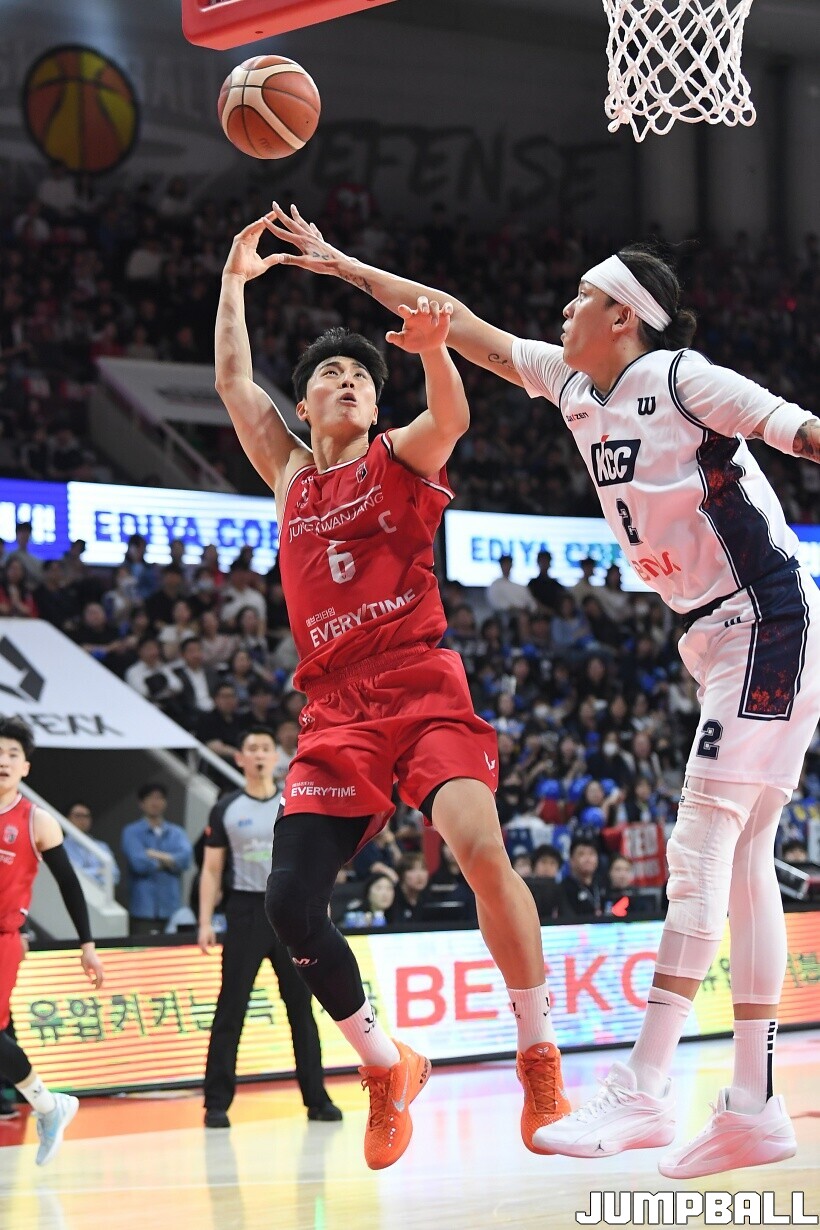 [점프볼=안양/유용우 기자] 24일 안양 정관장 아레나에서 열린 2025~2026 LG전자 프로농구 4강 플레이오프 1차전 안양 정관장과 부산 KCC의 경기, 정관장 박지훈이 수비를 두고 공격을 시도하고 있다.