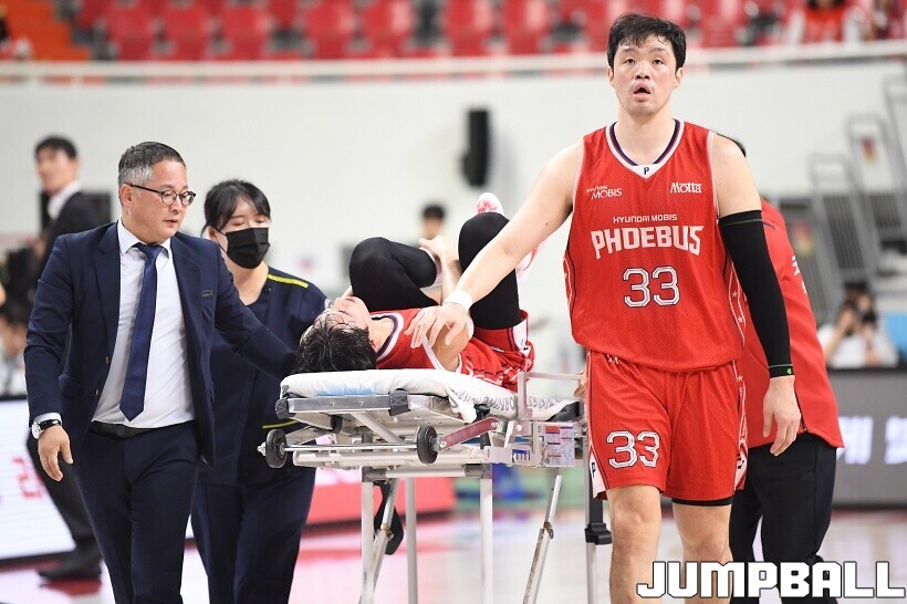 [점프볼=울산/유용우 기자] 30일 울산동천체육관에서 열린 2025-2026 LG전자 프로농구 울산 현대모비스와 원주 DB의 경기, 모비스 이승현이 부상으로 빠져나가는 박무빈을 걱정하고 있다.