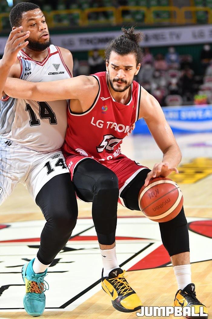 23일 창원실내체육관에서 열린 2021-2022 KGC인삼공사 정관장 프로농구 창원 LG와 안양 KGC인삼공사의 경기, LG 마레이가 돌파하며 공격을 시도하고 있다.