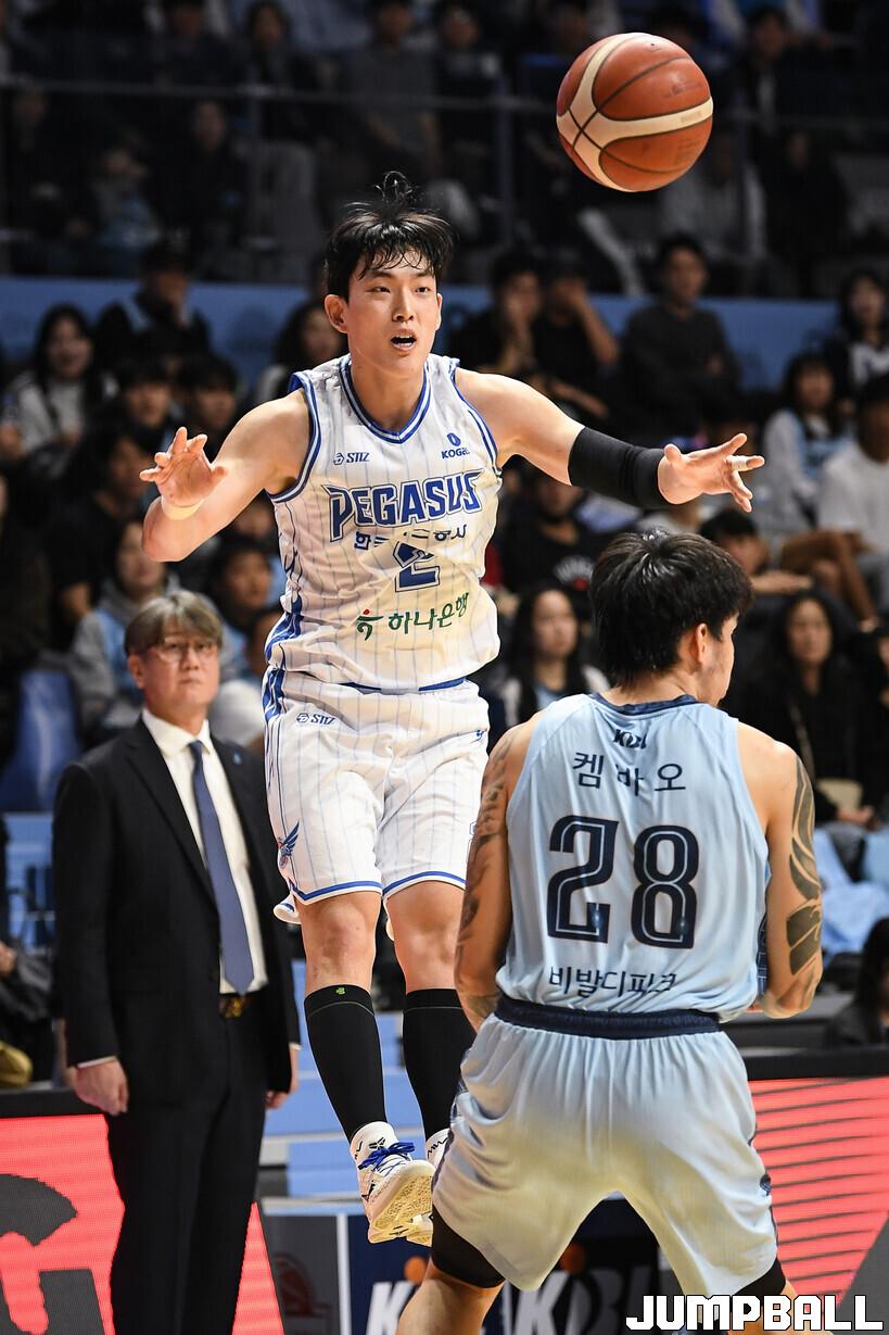 [점프볼=고양/유용우 기자] 13일 고양 소노 아레나에서 열린 2025-2026 LG전자 프로농구 고양 소노와 대구 한국가스공사의 경기, 가스공사 신승민이 골밑으로 패스를 넣고 있다.