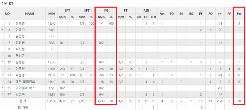 윌리엄스는 전반전 야투 난조(1/8)를 보이며 KT는 더 침묵했다. 결국 18-42로 크게 뒤처진 채 전반전을 끝냈다. 2쿼터까지 KT의 야투율은 단 20%(6/30)에 불과했다.