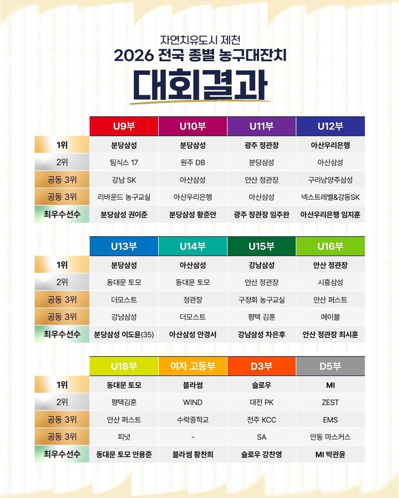 지난 7일 충청북도 제천시 일원에서 개막해 5박 6일간 열띤 경쟁이 펼쳐졌던 자연치유도시제천 2026 전국 종별 농구대잔치 12개 종별 111팀 중 12개 우승 팀이 모두 가려지며 막을 내렸다.