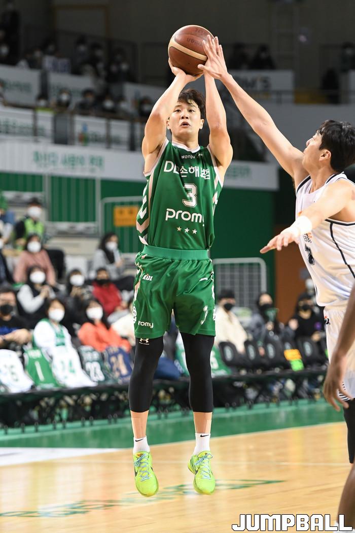 11일 원주종합체육관에서 열린 2021-2022 KGC인삼공사 정관장 프로농구 원주 DB와 전주 KCC의 경기, DB 허웅이 3점슛을 시도하고 있다.