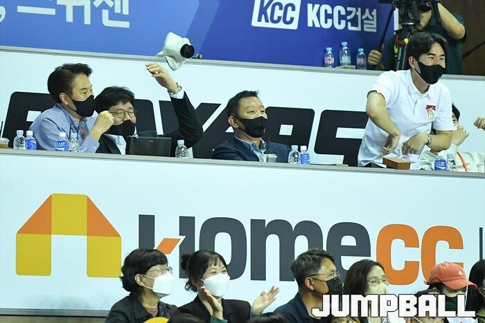 25일 전주실내체육관에서 열린 2022-2023 SKT 에이닷 프로농구 전주 KCC와 고양 캐롯의 경기, 허재 캐롯 대표이사가 전성현이 위닝 3점슛을 성공을 지켜보고 있다. [점프볼=전주/유용우 기자]