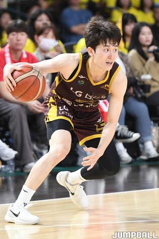 [점프볼=창원/박상혁 기자] 9일 창원체육관에서 열린 2024-2025 KCC 프로농구 창원 LG와 서울 SK의 챔피언결정전 3차전, LG 유기상이 점프슛을 시도하고 있다.