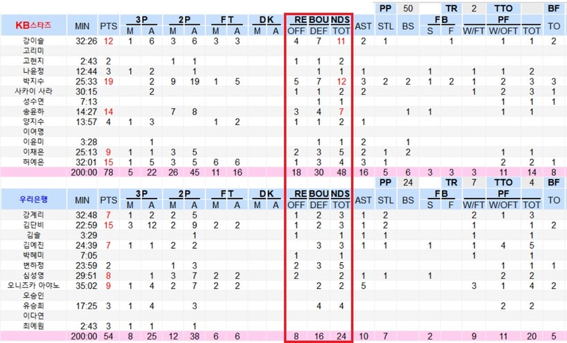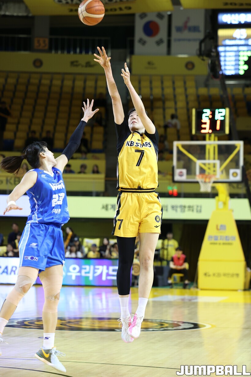 KB스타즈는 1차전 리바운드 싸움에서 53-31로 앞선 바 있다. 박지수(20점 12리바운드)뿐만 아니라 양 팀 가운데 최단신 허예은도 리바운드가 포함된 더블더블(15점 10리바운드)을 작성할 정도였다.