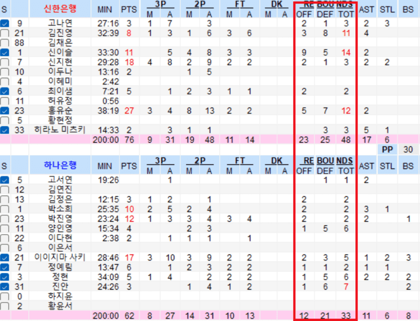 무엇보다 돋보였던 수치는 리바운드였다. 무려 49개를 잡아냈다. 이 가운데 공격 리바운드는 13개였다. 49개는 하나은행 구단 역대로 봐도 상당한 기록이었다. 공동 5위에 해당했다. 1위는 56개. 2017년 10월 30일 용인 삼성생명을 상대로 잡아낸 바 있다. 참고로 WKBL 역대 1위는 우리은행의 62개였다.