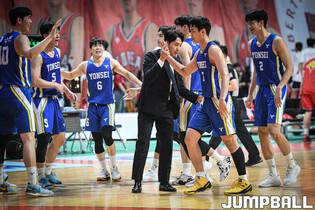 8일 고양체육관에서 열린 2023 정기 고연전, 연세대 강지훈이 골밑에서 공격을 시도하고 있다.