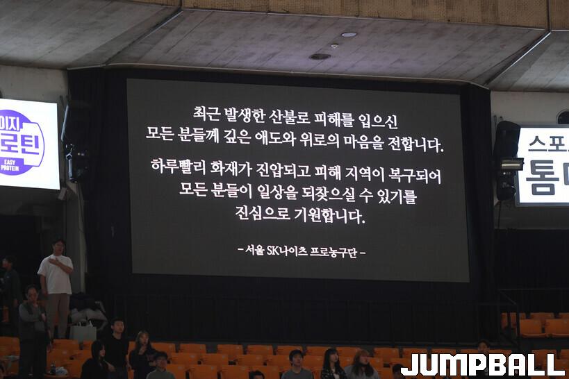 [점프볼=잠실학생/홍성한 기자] "최근 발생한 산불로 피해를 입으신 모든 분들께 깊은 애도와 위로의 마음을 전합니다."
