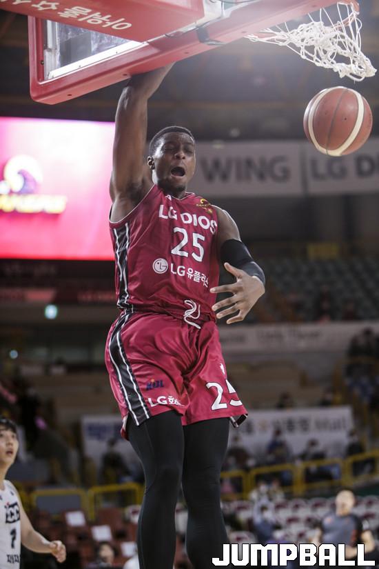 [점프볼=정을호 기자] 17 창원실내체육관에서 열린 2020-2021 현대모비스 프로농구  창원LG 전주 KCC 경기, LG 캐디 라렌이 덩크슛을 시도하고 있다.