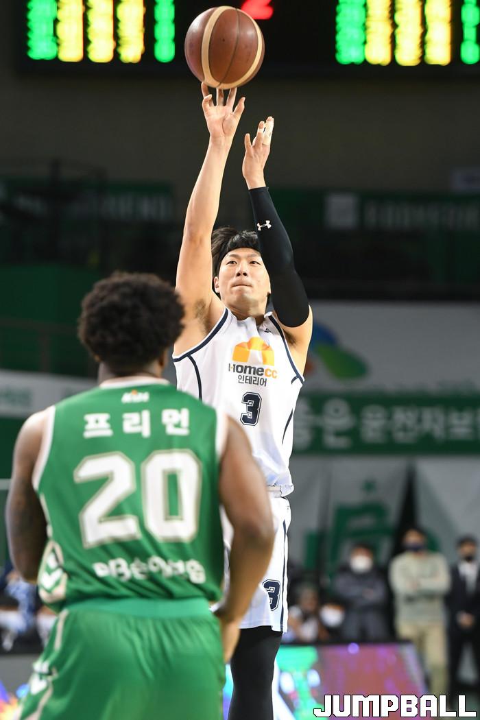 11일 원주종합체육관에서 열린 2021-2022 KGC인삼공사 정관장 프로농구 원주 DB와 전주 KCC의 경기, KCC 이정현이 3점슛을 시도하고 있다.