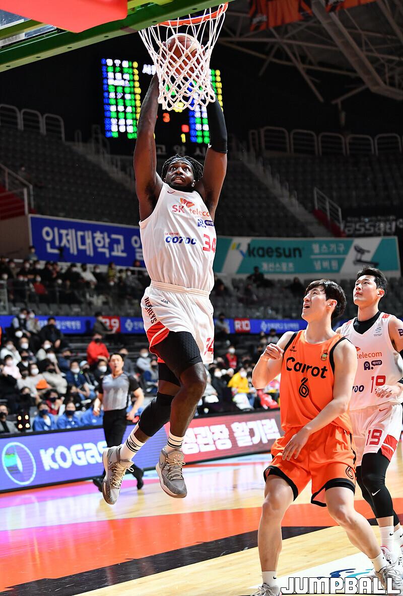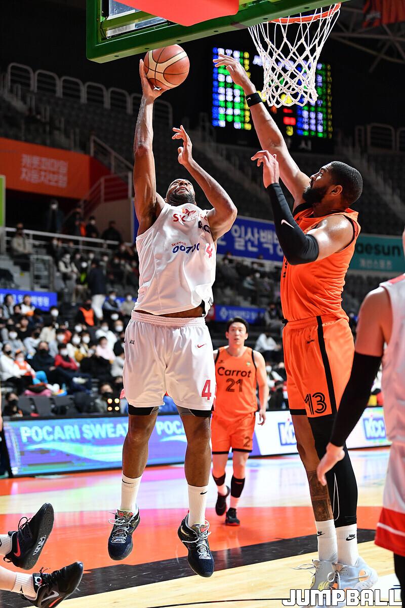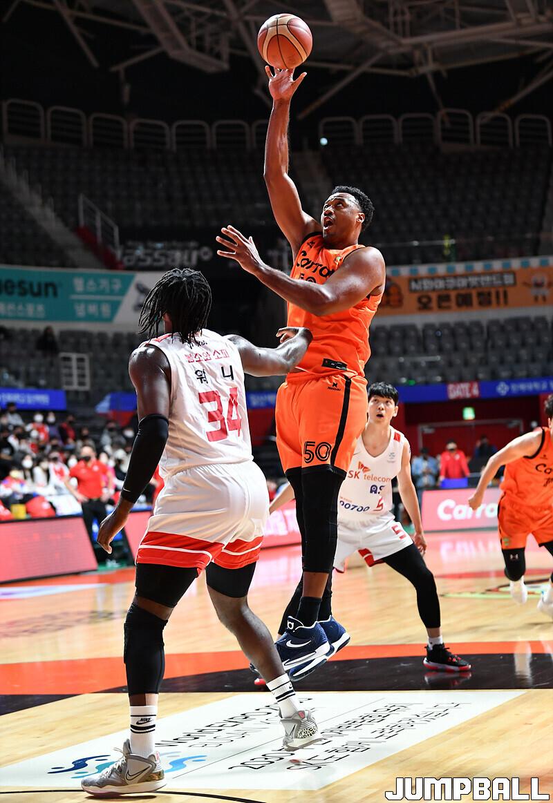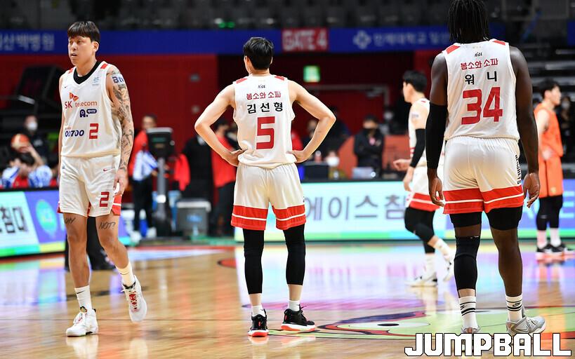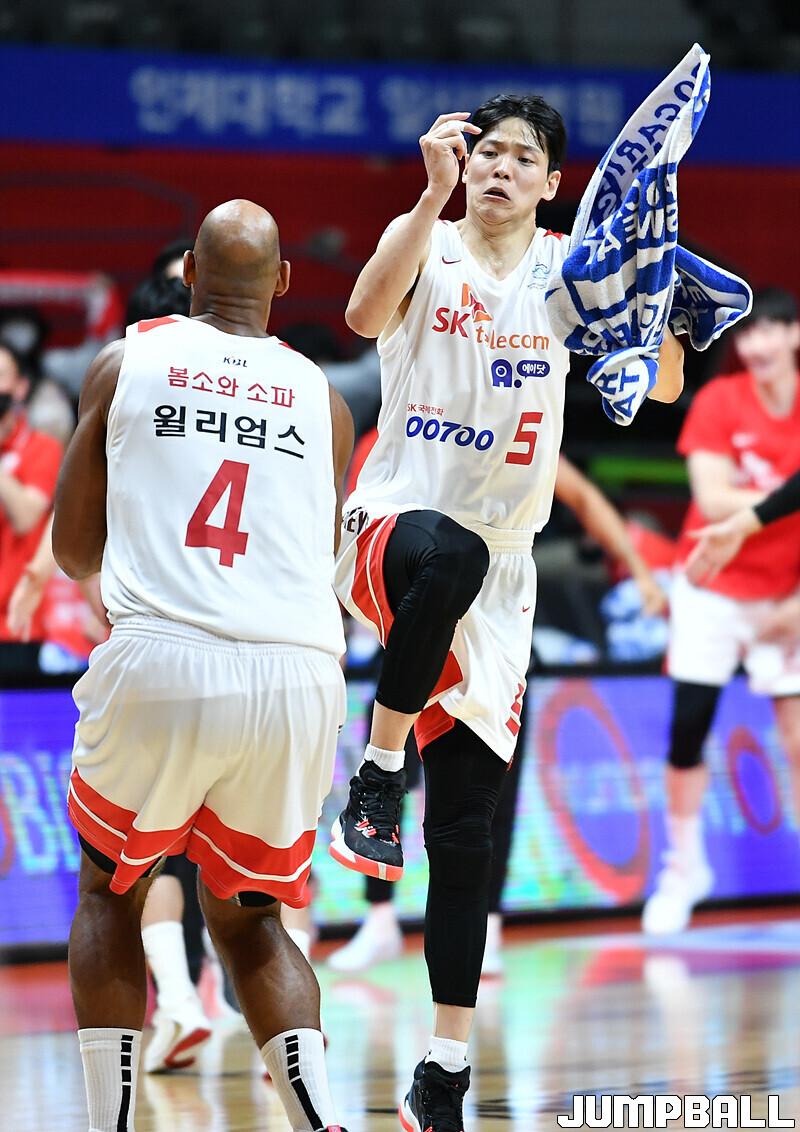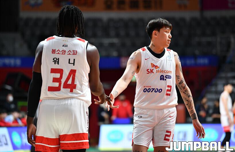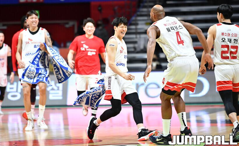 SK는 자밀 워니(19점 4리바운드 2스틸), 허일영(15점 4리바운드), 최성원(14점 7리바운드 8어시스트), 리온 윌리엄스(12점 7리바운드 2어시스트), 김선형(11점 2리바운드 7어시스트)이 고르게 득점했다.