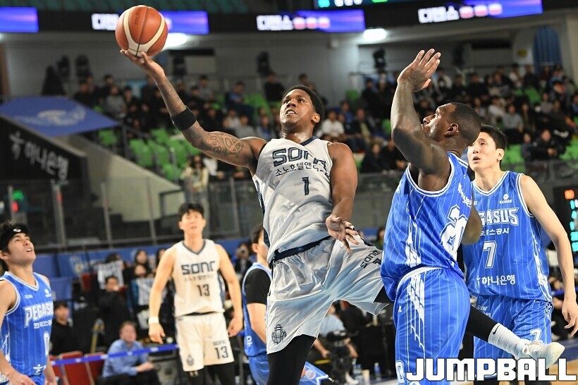 [점프볼=대구/유용우 기자] 5일 대구체육관에서 열린 2025-2026 LG전자 프로농구 대구 한국가스공사와 고양 소노의 경기, 소노 나이트가 돌파하며 골밑 공격을 시도하고 있다.
