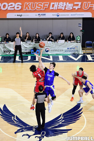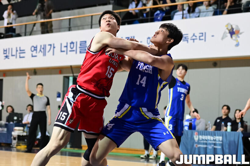 [점프볼=신촌/박상혁 기자] 27일 연세대학교 신촌캠퍼스 체육관에서 열린 2026 KUSF 대학농구 U-리그 연세대와 고려대의 경기, 고려대 김정현다니엘과 연세대 위진석이 리바운드를 잡기 위해 몸싸움을 하고 있다.