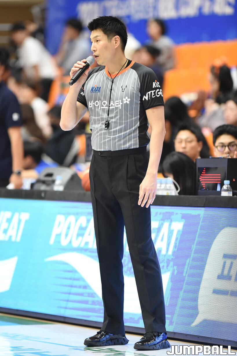 [점프볼=제천/박상혁 기자] 7일 제천체육관에서 열린 2024 DB손해보험 KBL 컵대회 in 제천 대구 한국가스공사와 상무의 경기, KBL 박경진 심판이 마이크를 잡고 비디오 판독 결과를 발표하고 있다.