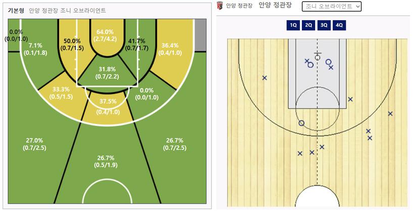 | ▲ KT와의 경기 전까지 오브라이언트의 시즌 슛 차트(좌), 12일 KT전 오브라이언트의 슛 차트(우) |