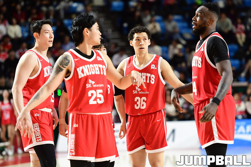 [점프볼=잠실학생/박상혁 기자] 6일 잠실학생체육관에서 열린 2025-2026 LG전자 프로농구 서울 SK와 서울 삼성의 S더비 경기, SK 선수들이 경기 중 모여서 대화를 나누고 있다.