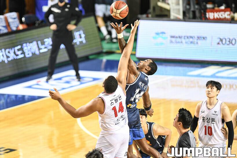 23일 전주실내체육관에서 열린 2022-2023 SKT 에이닷 프로농구 전주 KCC와 안양 KGC인삼공사의 경기, 점프볼로 경기가 시작되었다.