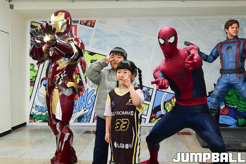 [점프볼=창원/박상혁 기자] 23일 창원체육관에서 열린 2025-2026 LG전자 프로농구 창원 LG와 대구 한국가스공사의 경기, 마블매치를 맞이해 준비한 마블 포토존에서 LG 어린이팬들이 기념 사진 촬영을 하고 있다.