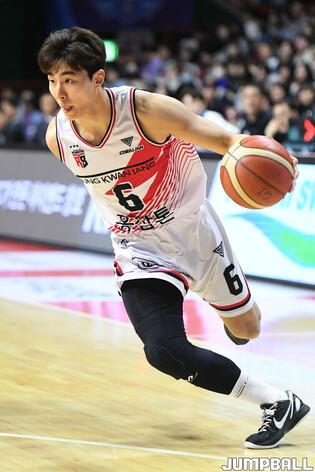 [점프볼=부산/박상혁 기자] 26일 부산사직체육관에서 열린 2023-2024 정관장 프로농구 부산 KCC와 안양 정관장의 경기, 정관장 배병준이 페이드어웨이슛을 시도하고 있다.