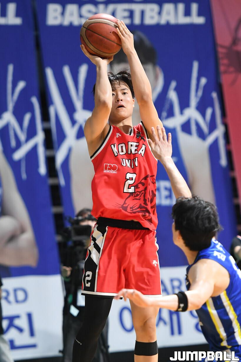 [점프볼=고양/박상혁 기자] 27일 고양 소노 아레나에서 열린 2024 정기 연고전 경기, 고려대 심주언이 3점슛을 시도하고 있다.