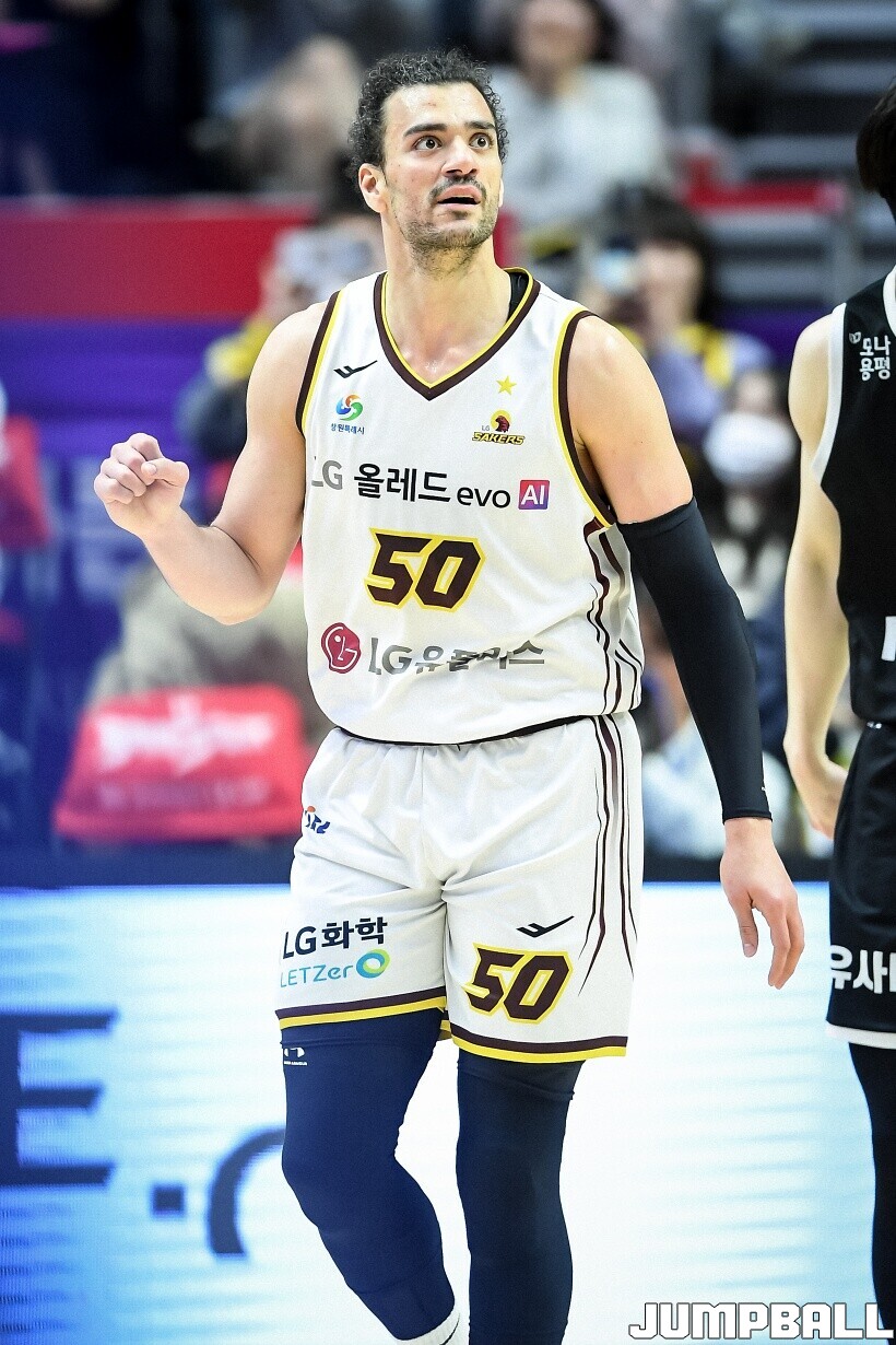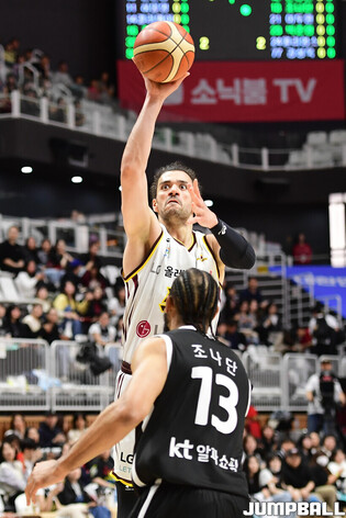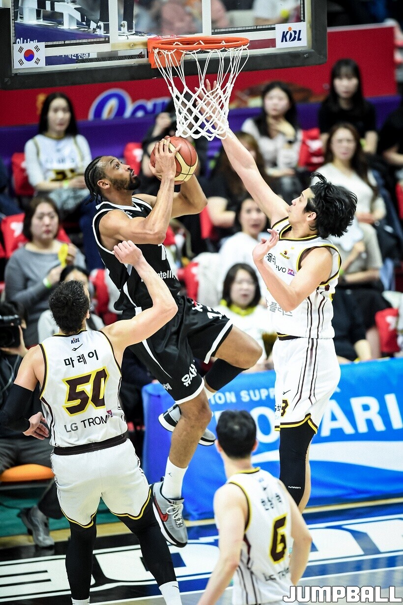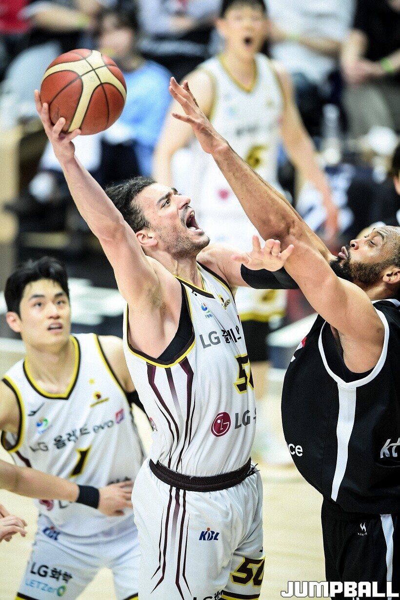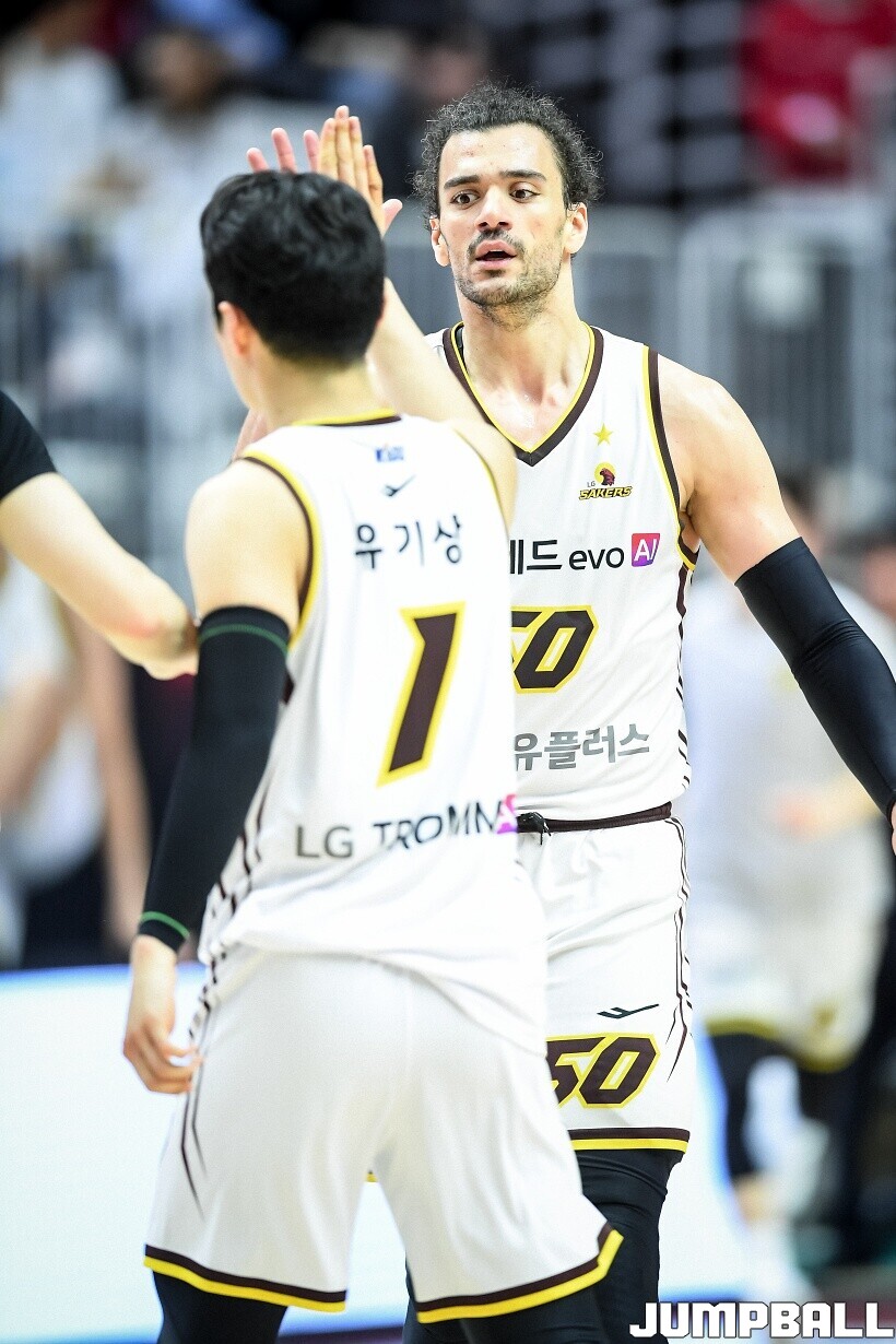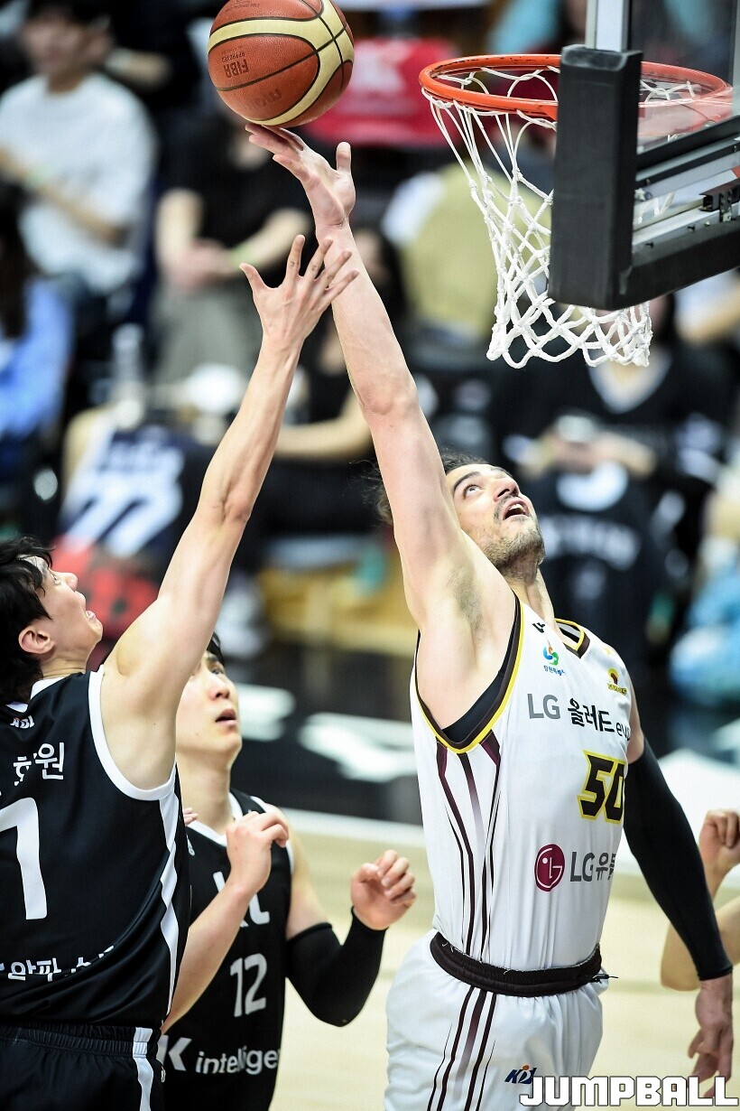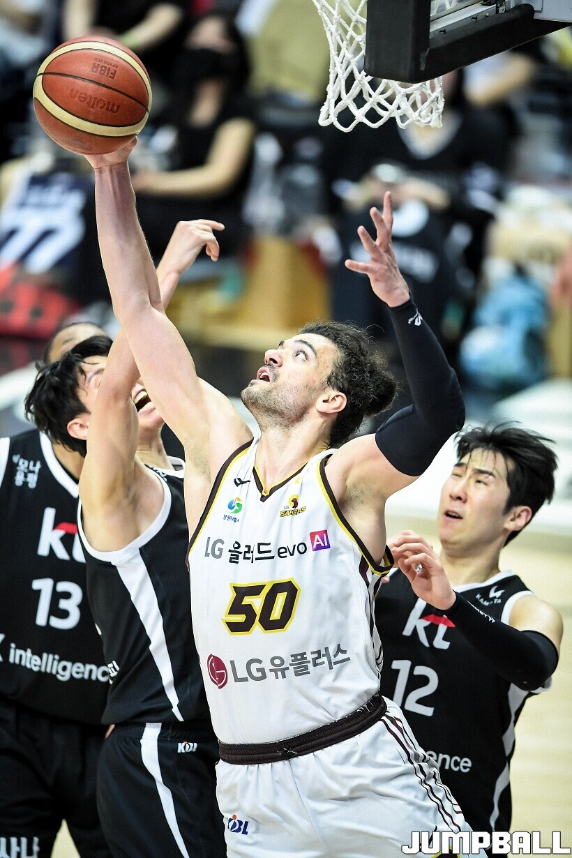 [점프볼=수원/유용우 기자] 3일 KT 소닉붐 아레나에서 열린 2025-2026 LG전자 프로농구 수원 KT와 창원 LG의 경기, 아셈 마레이가 21점 15리바운드 8어시스트 1스틸 2블록을 기록하며 맹활약한 가운데, LG가 87-60으로 KT에 승리하며 정규리그 우승을 확정지었다.