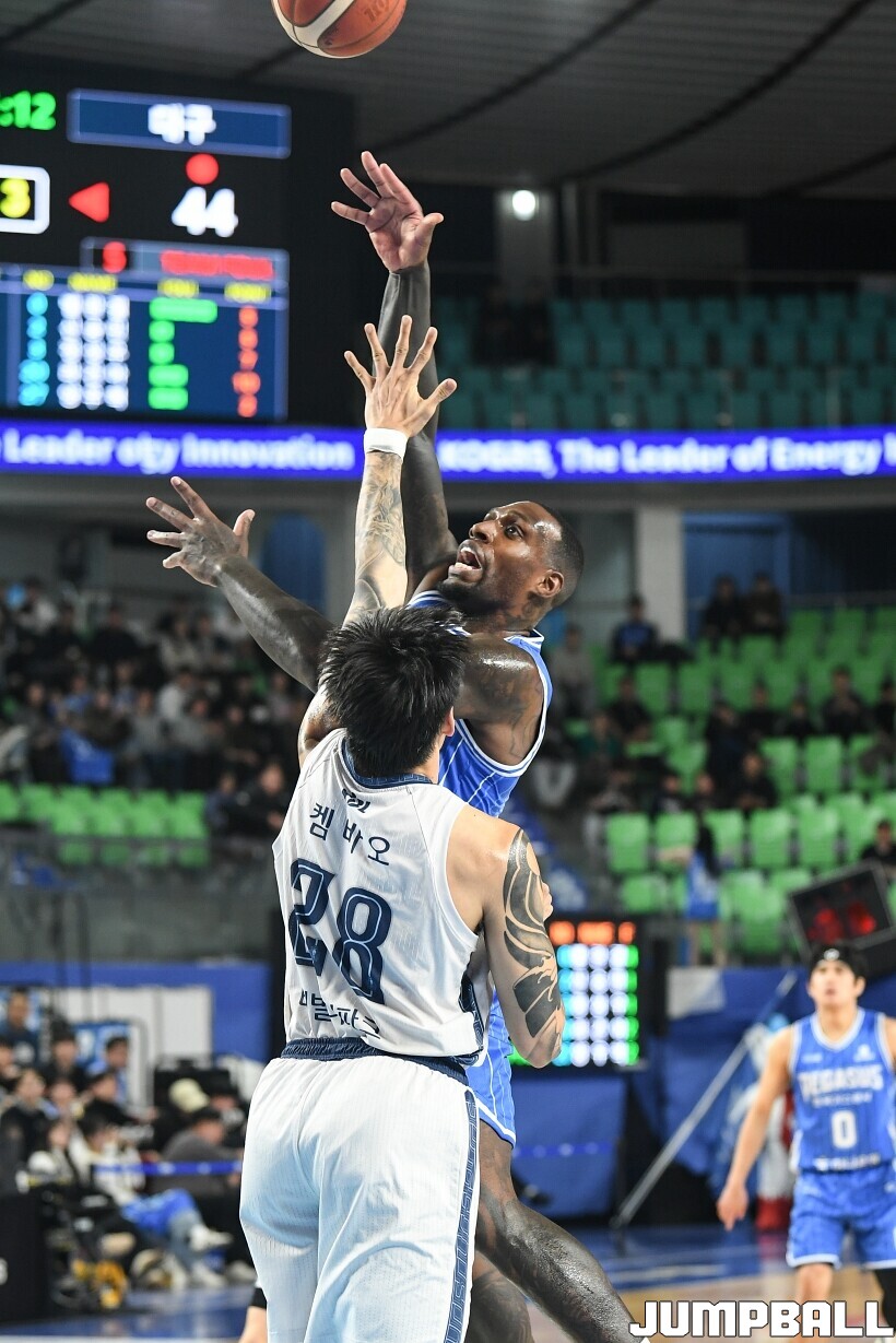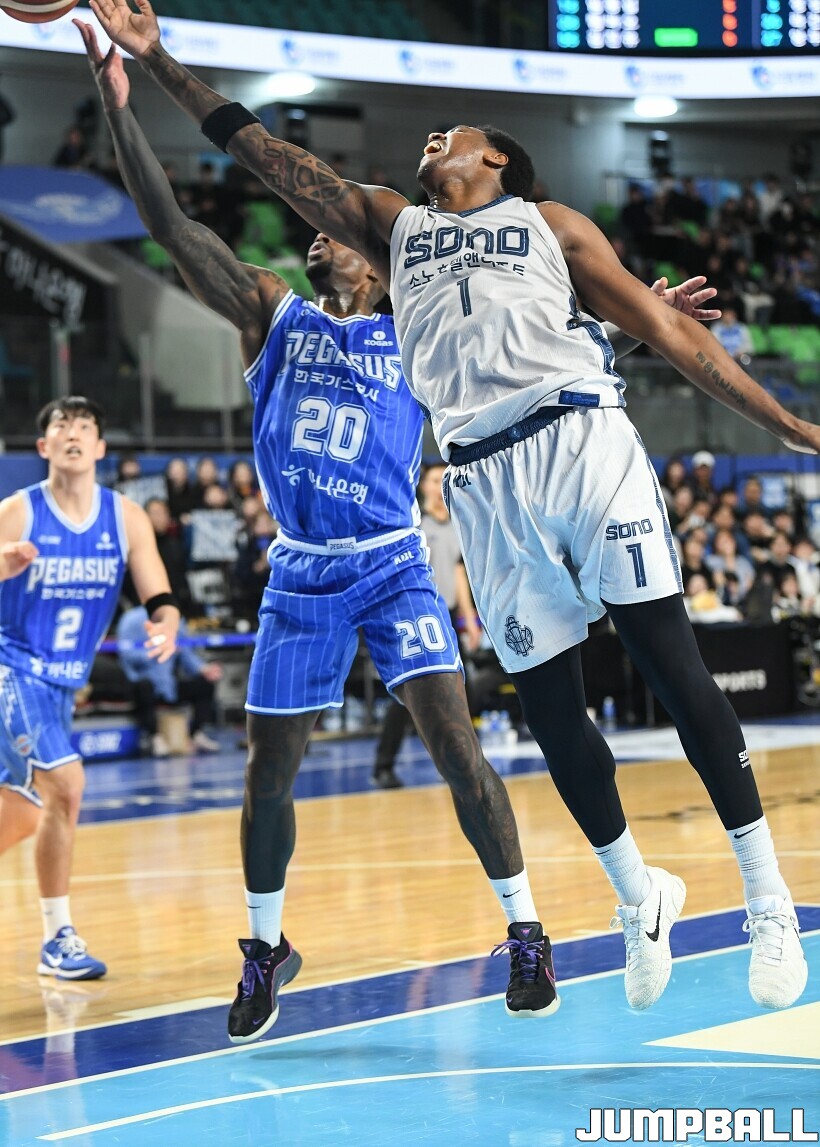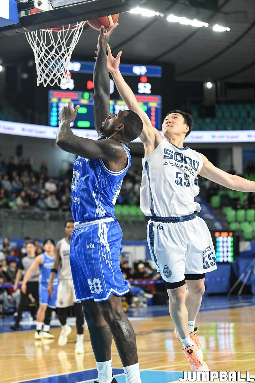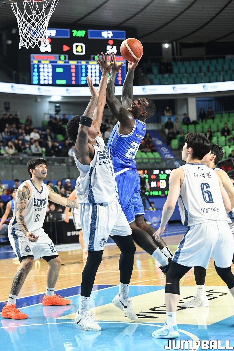 [점프볼=대구/유용우 기자] 5일 대구체육관에서 열린 2025-2026 LG전자 프로농구 대구 한국가스공사와 고양 소노의 경기, 소노는 77-67로 가스공사에 원정 승리했다. 나이트 25점, 이정현 15점 총 40점을 합작한 소노는 라건아와 정성우가 각각 15점씩을 올린 가스공사를 따돌리며 원정 승리를 거뒀다.