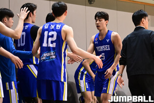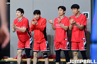[점프볼=신촌/박상혁 기자] 27일 연세대학교 신촌캠퍼스 체육관에서 열린 2026 KUSF 대학농구 U-리그 연세대와 고려대의 경기, 고려대 주희정 감독이 선수들과 하이파이브를 하고 있다.