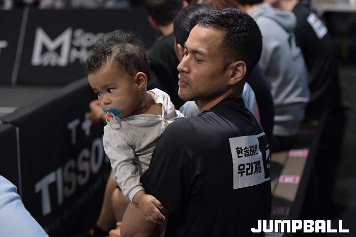 [점프볼=고양/박상혁 기자] 2일 고양 스타필드 스포츠 몬스터 특설코트에서 열린 '컴투스 KOREA 3X3 프리미어리그 2020' 1라운드 경기, 한솔레미콘 전태풍이 아기와 함께 경기를 지켜보고 있다.