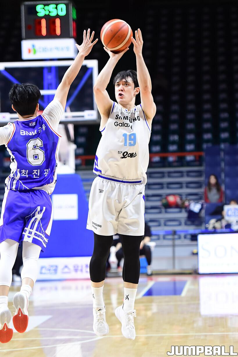 [점프볼=부산/박상혁 기자] 24일 부산사직체육관에서 열린 2025-2026 LG전자 프로농구 부산 KCC와 서울 삼성의 경기, 삼성 이근휘가 3점슛을 시도하고 있다.