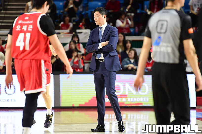 [점프볼=잠실학생/박상혁 기자] 6일 잠실학생체육관에서 열린 2025-2026 LG전자 프로농구 서울 SK와 서울 삼성의 S더비 경기, SK 전희철 감독이 선수들을 바라보고 있다.