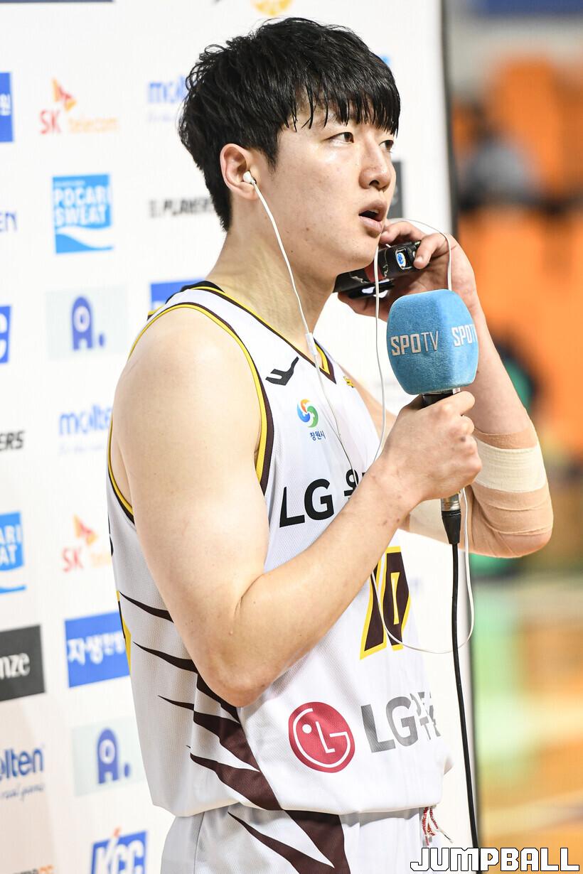 18일 전주실내체육관에서 열린 2022-2023 SKT 에이닷 프로농구 전주 KCC와 창원 LG의 경기, LG 윤원상이 승리 후 인터뷰를 하고 있다.