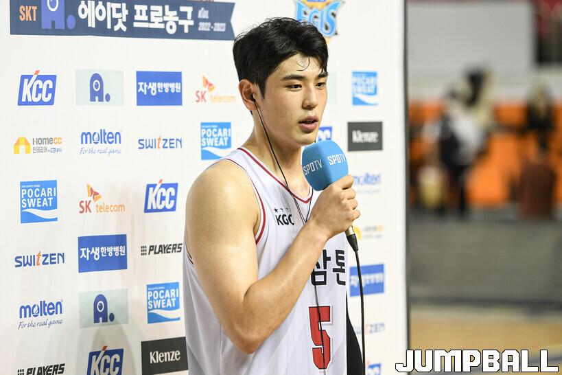 23일 전주실내체육관에서 열린 2022-2023 SKT 에이닷 프로농구 전주 KCC와 안양 KGC인삼공사의 경기, KGC가 KCC에 84-82로 승리했다. KGC 변준형이 승리 후 인터뷰를 하고 있다.