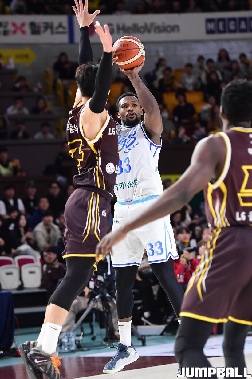 [점프볼=창원/박상혁 기자] 23일 창원체육관에서 열린 2025-2026 LG전자 프로농구 창원 LG와 대구 한국가스공사의 경기, 한국가스공사 퍼킨스가 3점슛을 시도하고 있다.
