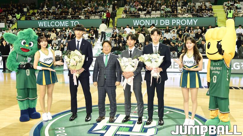 [점프볼=원주/박상혁 기자] 18일 원주 DB 프로미 아레나에서 열린 2025-2026 LG전자 프로농구 원주 DB와 고양 소노의 경기, 드래프트를 통해 DB에 지명된 이유진과 김휴범, 송재환이 권순철 단장과 함께 기념 사진 촬영을 하고 있다.